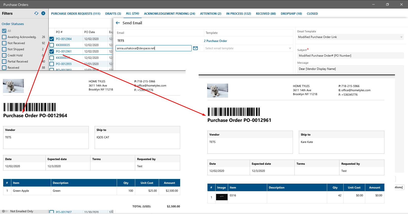 - Open PO list, check some POs (same Vendor) → Click Send Emails
