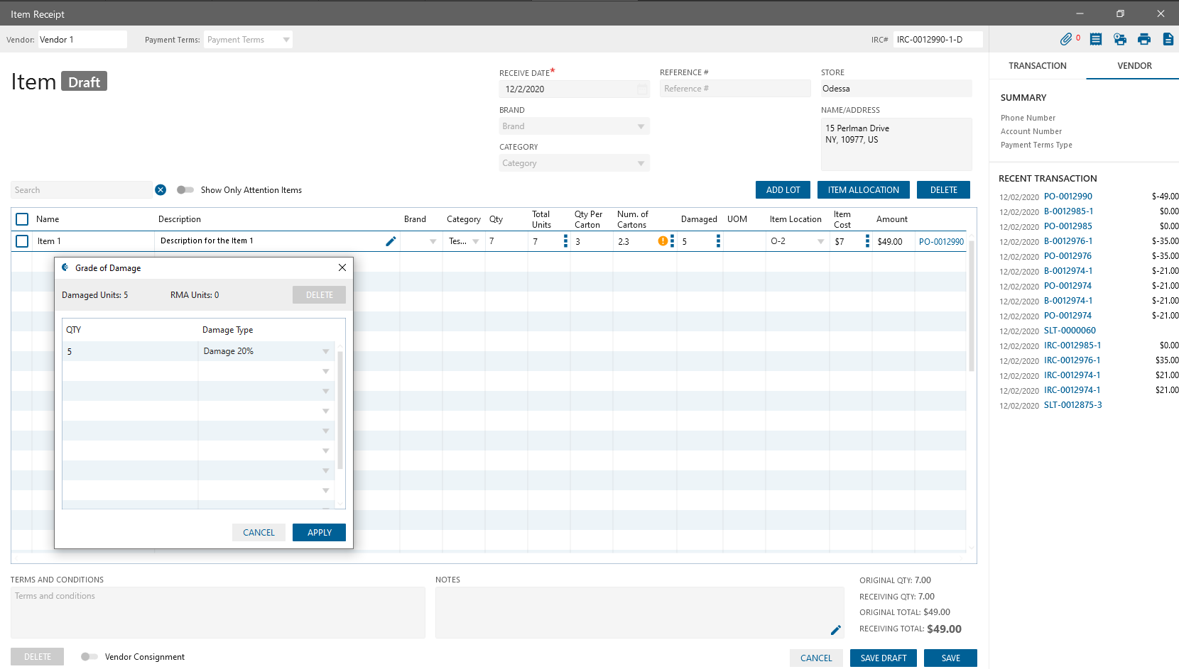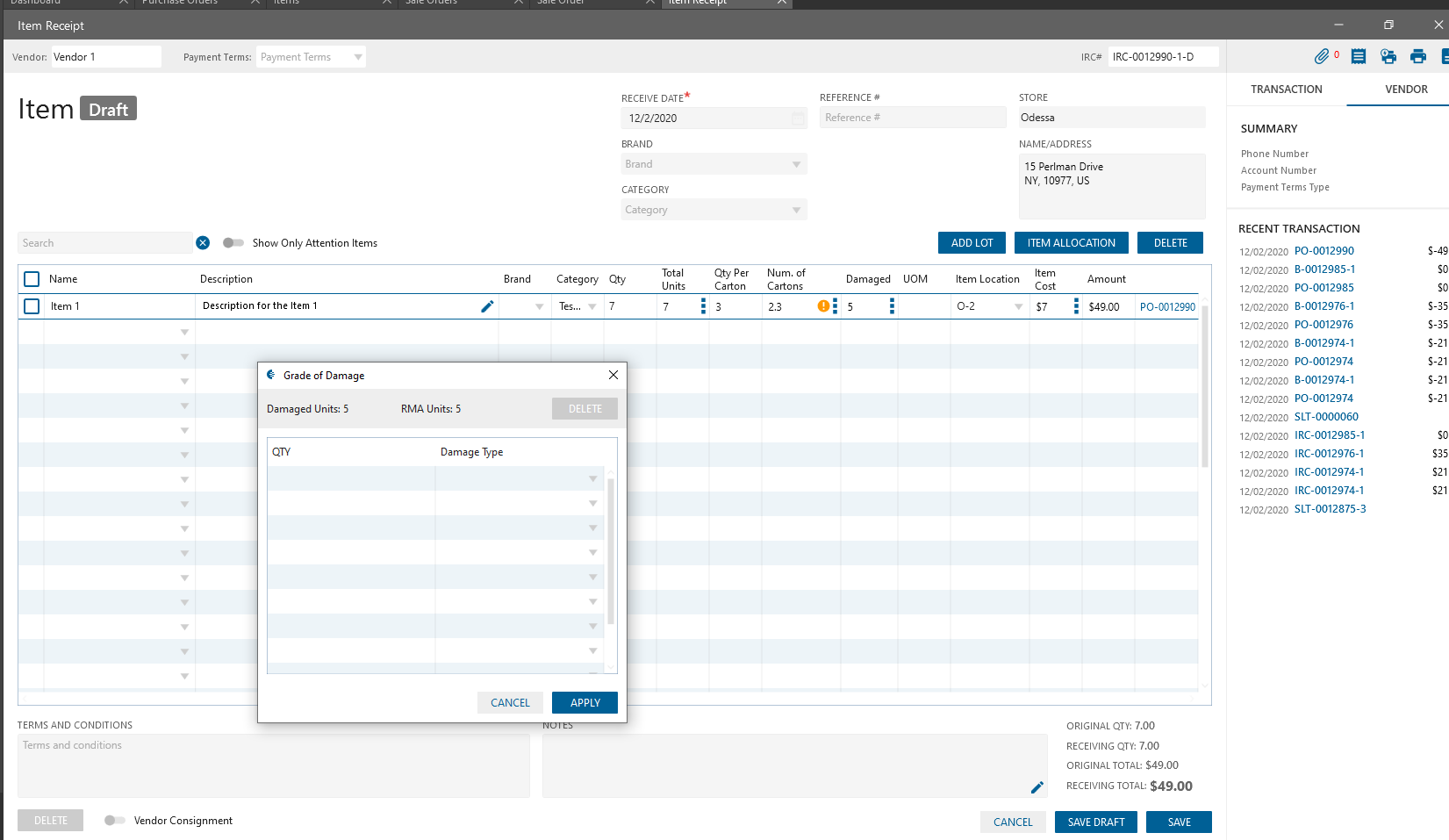 - In opening Grade of Damage Pop-up enter Qty 10, select Damage Type → Apply