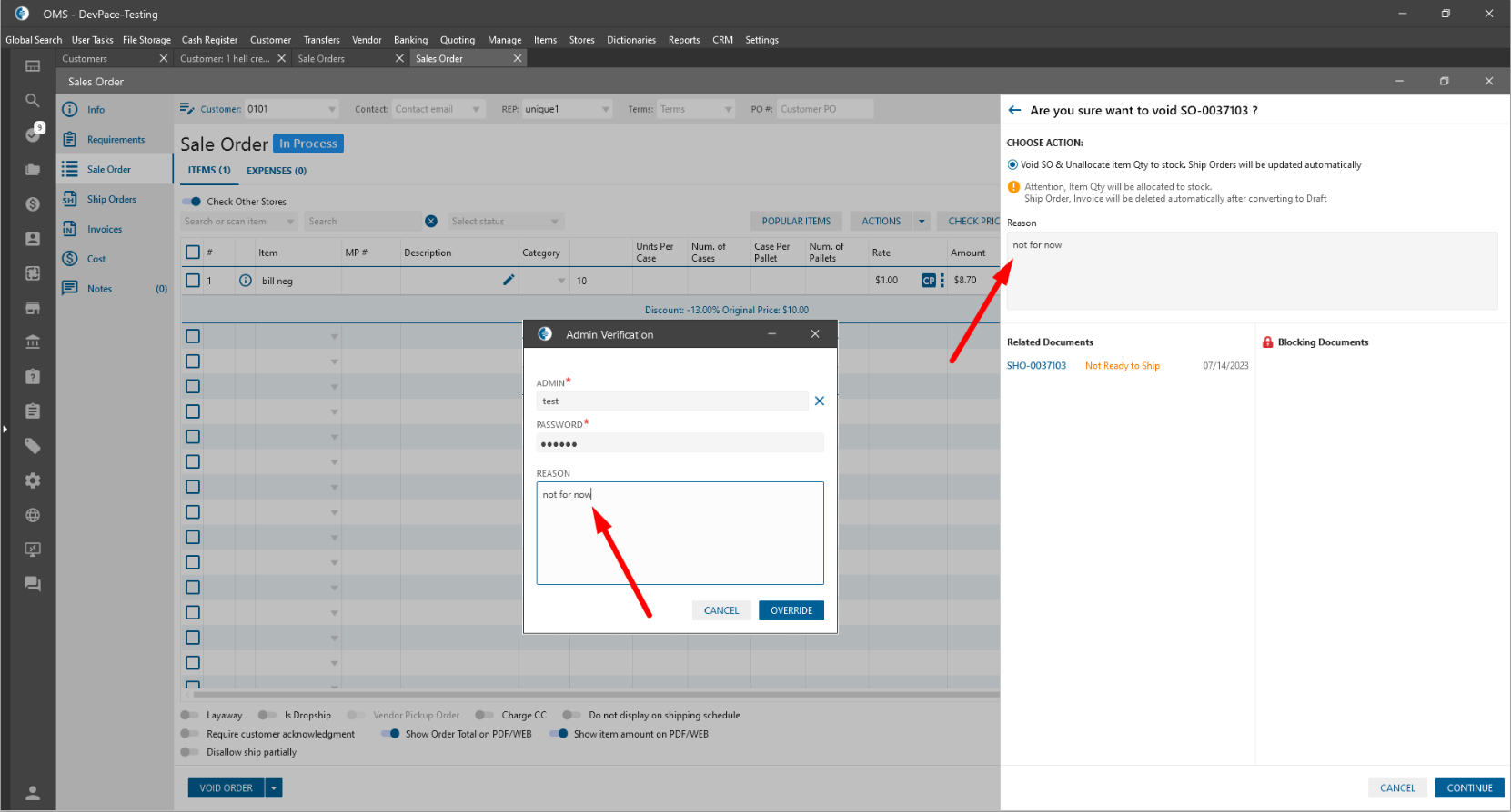 - the “Void Order” panel is opened with the filled-in Reason from the Admin Verification pop-up.