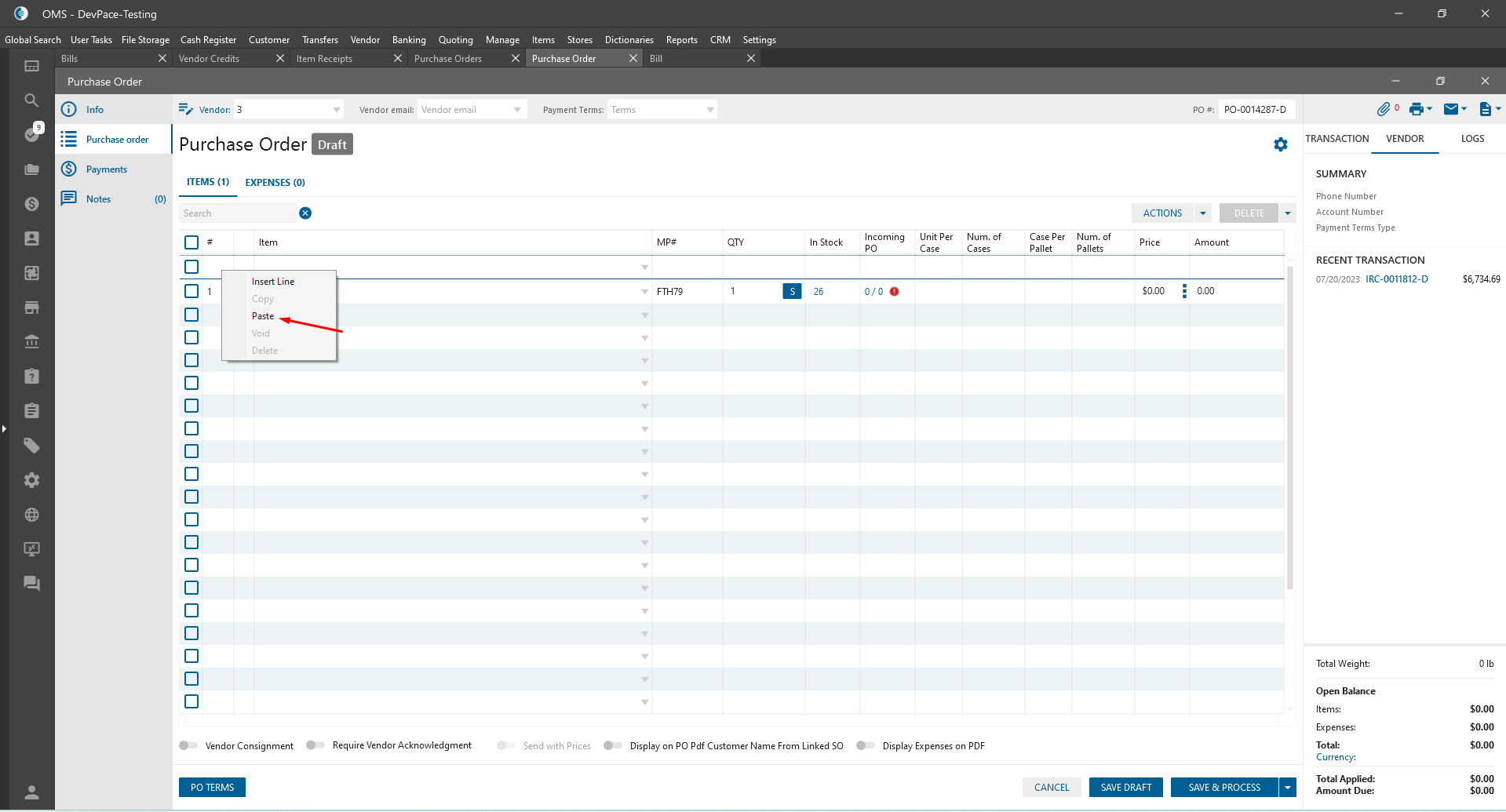 - Paste (PO\BIll\Item Receipt\Vendor Credit):