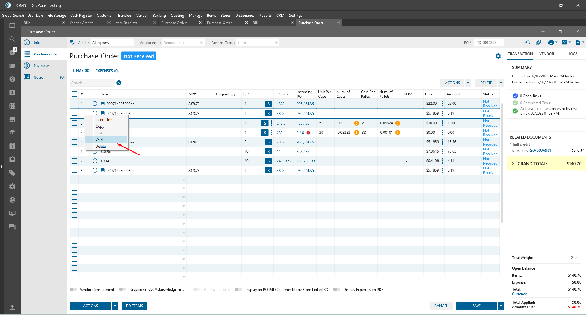 - Void (only purchase order):