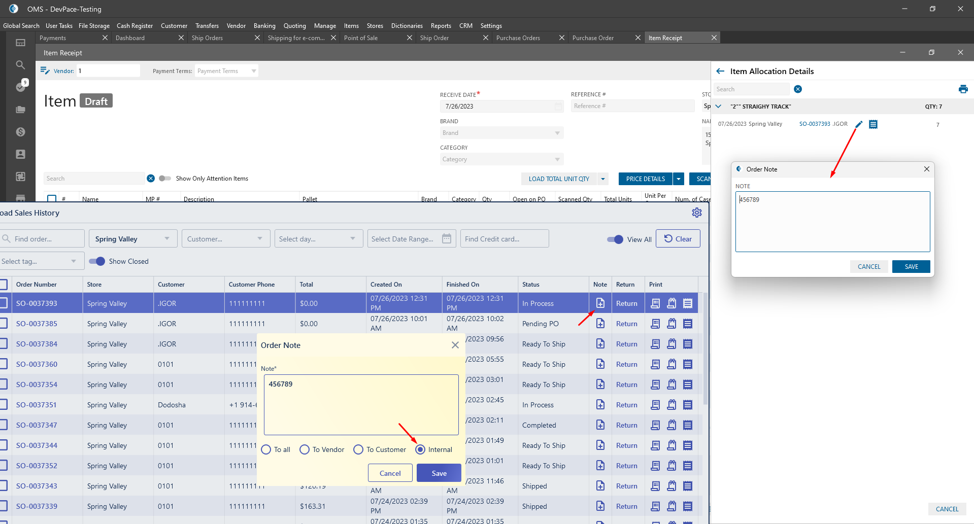 - Item Receipt -> Item Allocation panel -> Add Note: