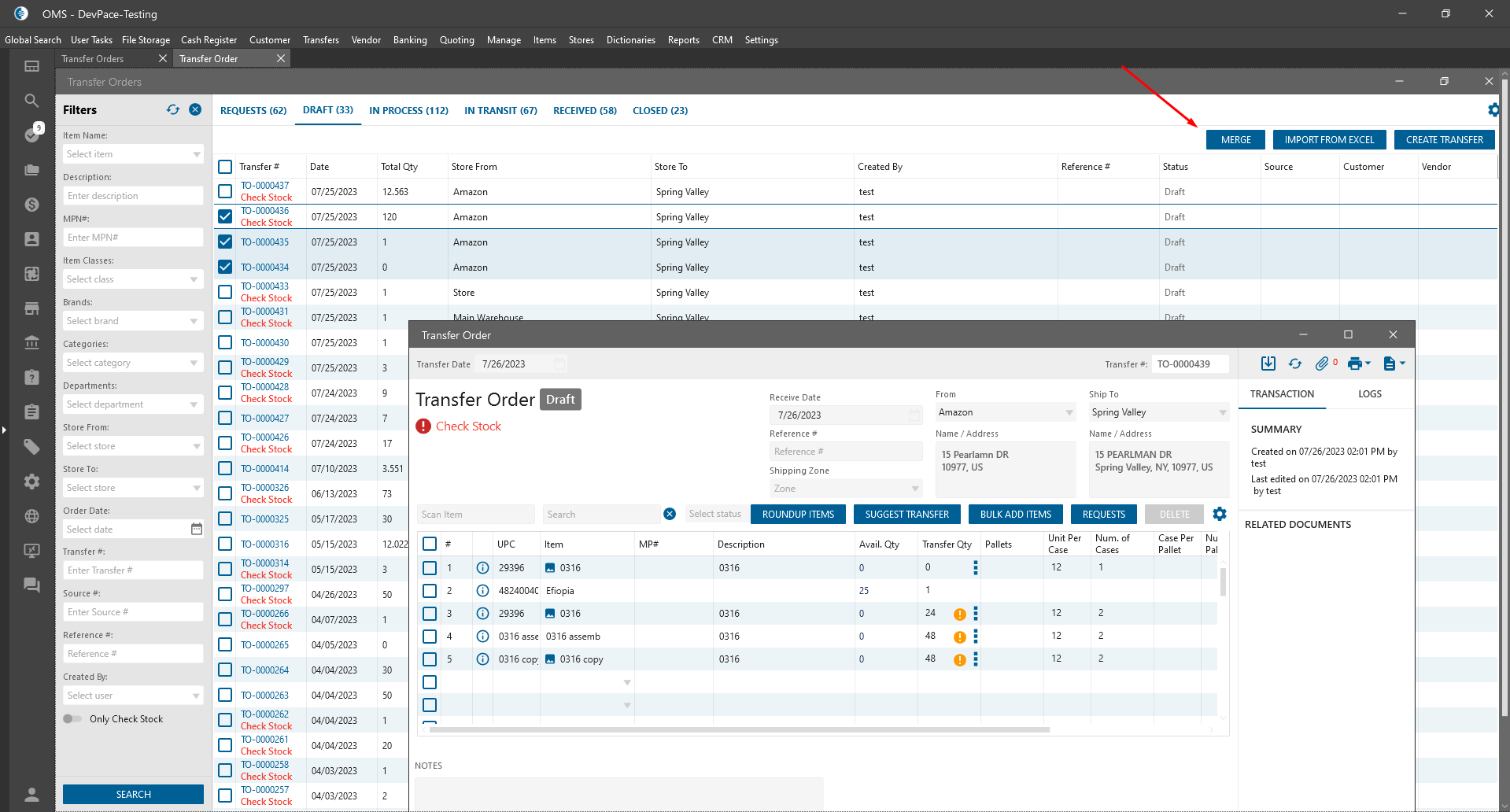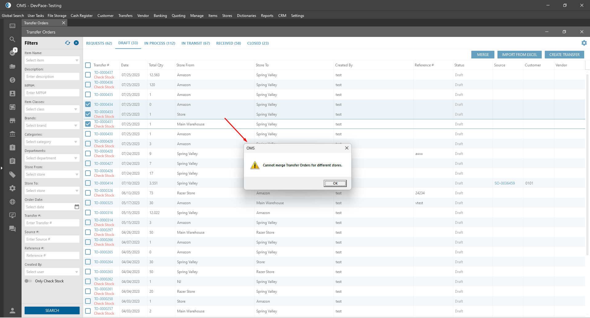 - Text: “Cannot merge Transfer Orders for different stores”;