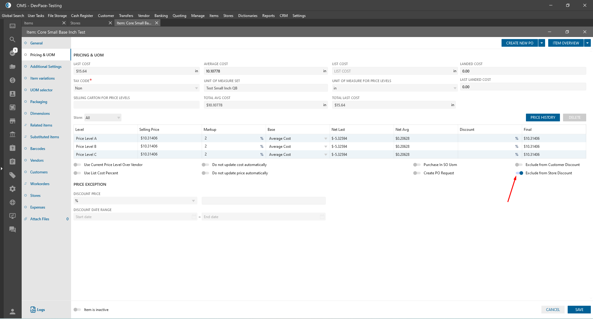 - was added to the Pricing & UOM tab -> after the “Exclude from Customer Discount” checkbox only for inventory and assembly items;