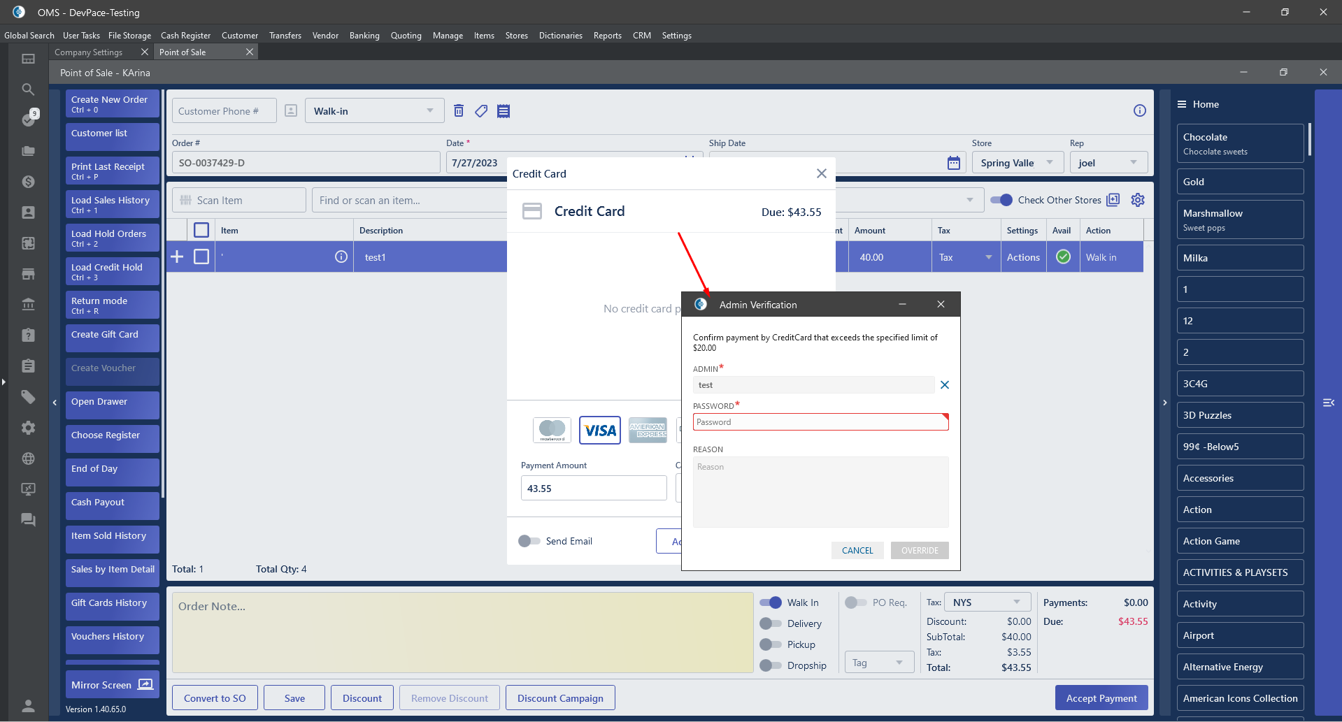 - if Credit Card / Gift Card / Voucher Payment more than “Max Credit Card / Gift Card / Voucher Payment” -> after clicking on the Accept button -> the “Admin verification” pop-up is opened;