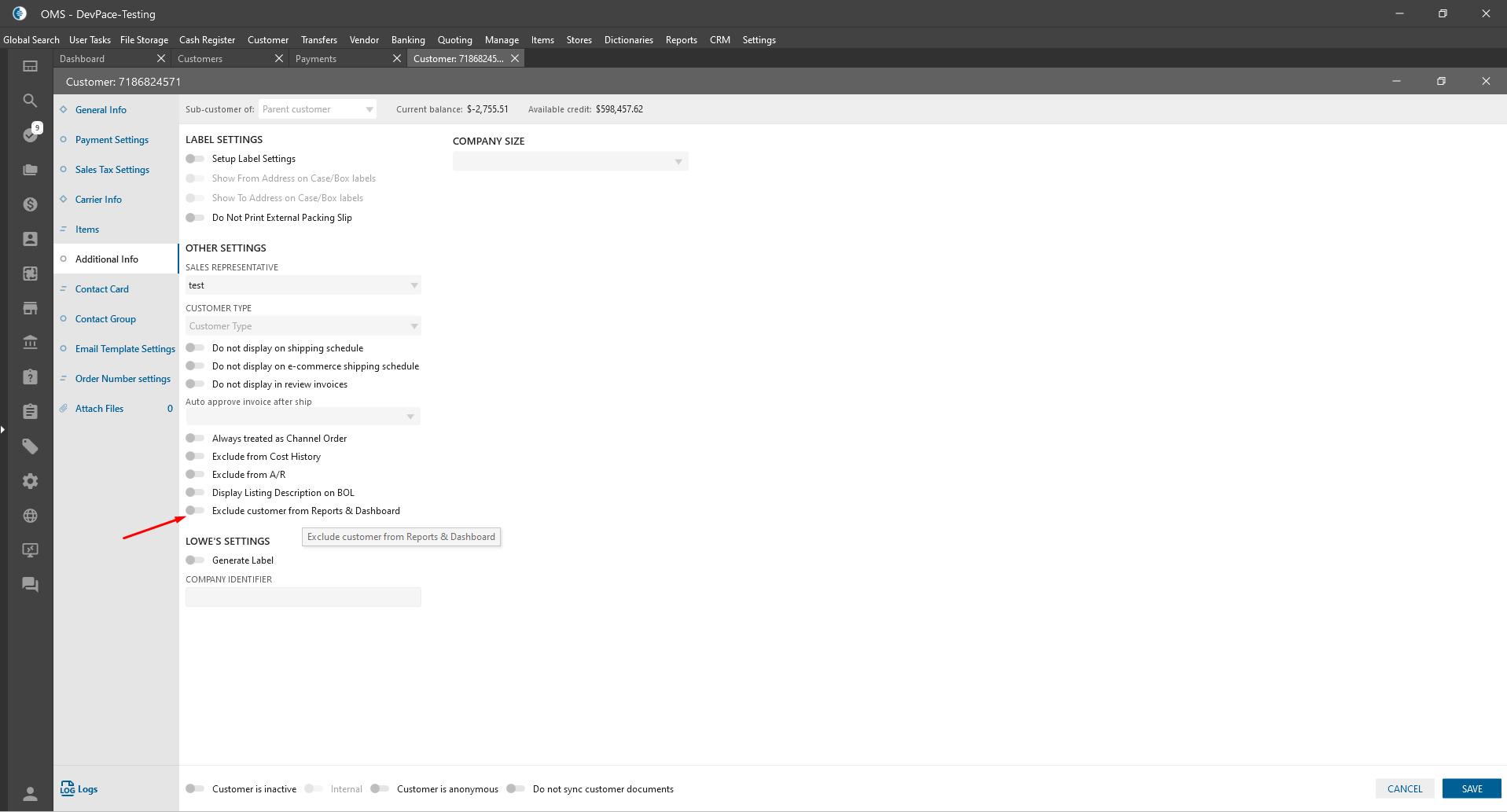 - “Exclude customer from Reports & Dashboard” checkbox: