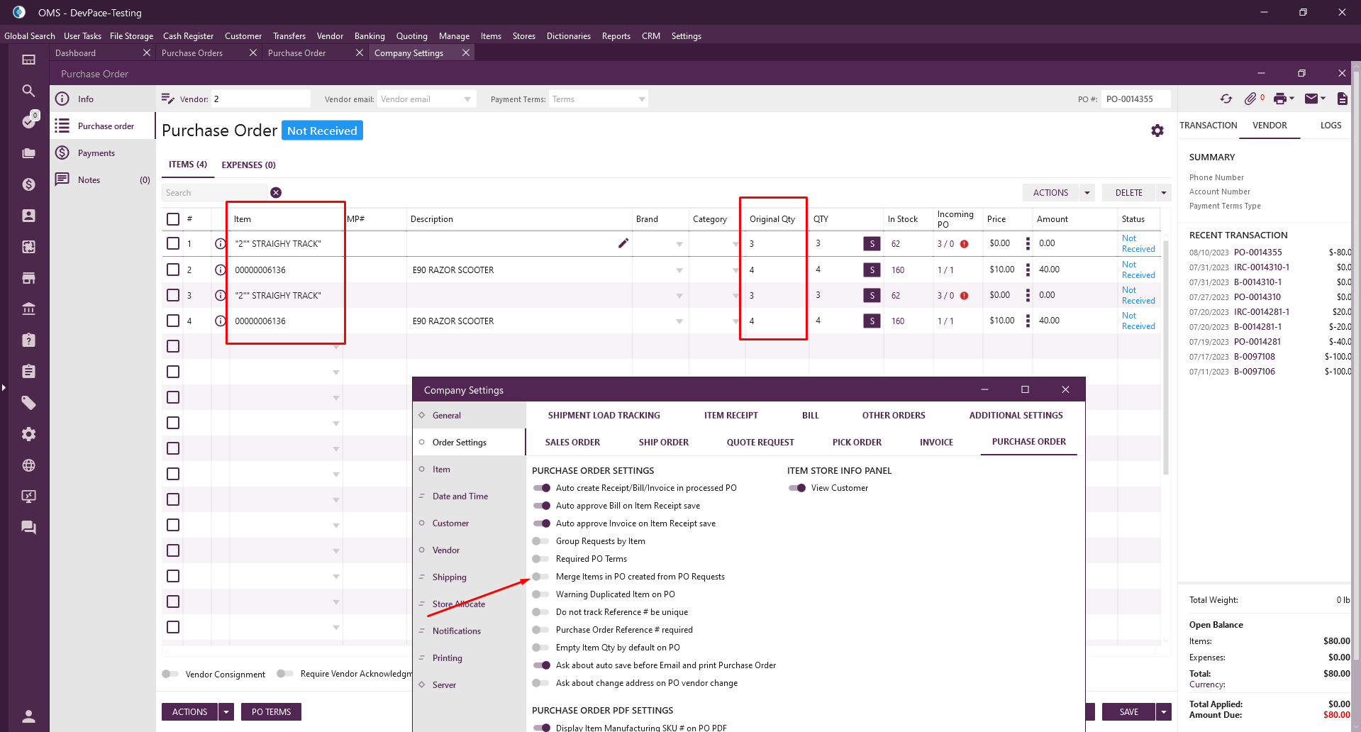 - In Company Settings -> the “Merge Items in PO created from PO Requests” checkbox is unchecked;