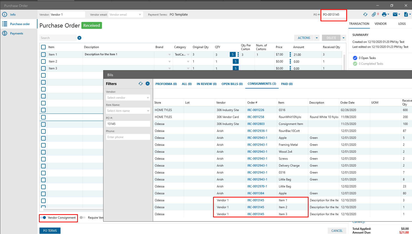 If PO was created for several Items and on this PO edit form was checked Vendor Consignment checkbox then