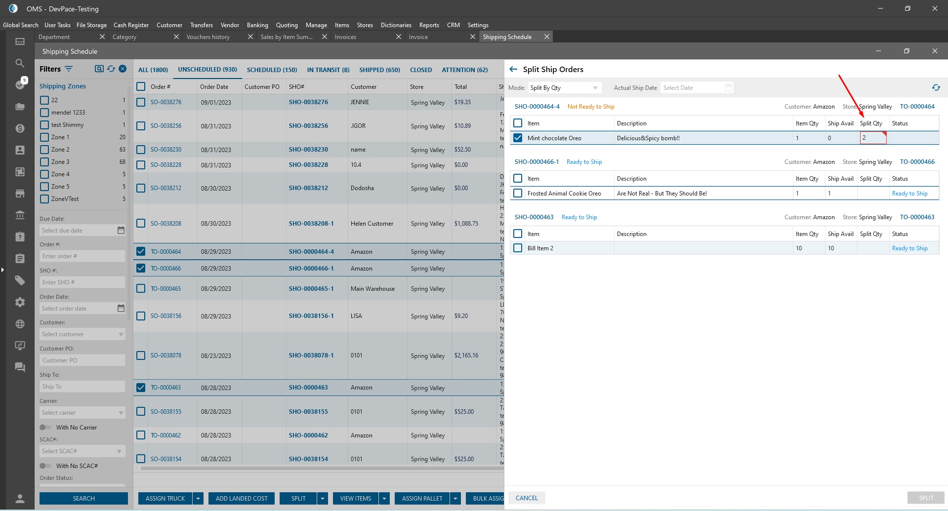 The “Split Ship Orders” panel on the Shipping Schedule List form
