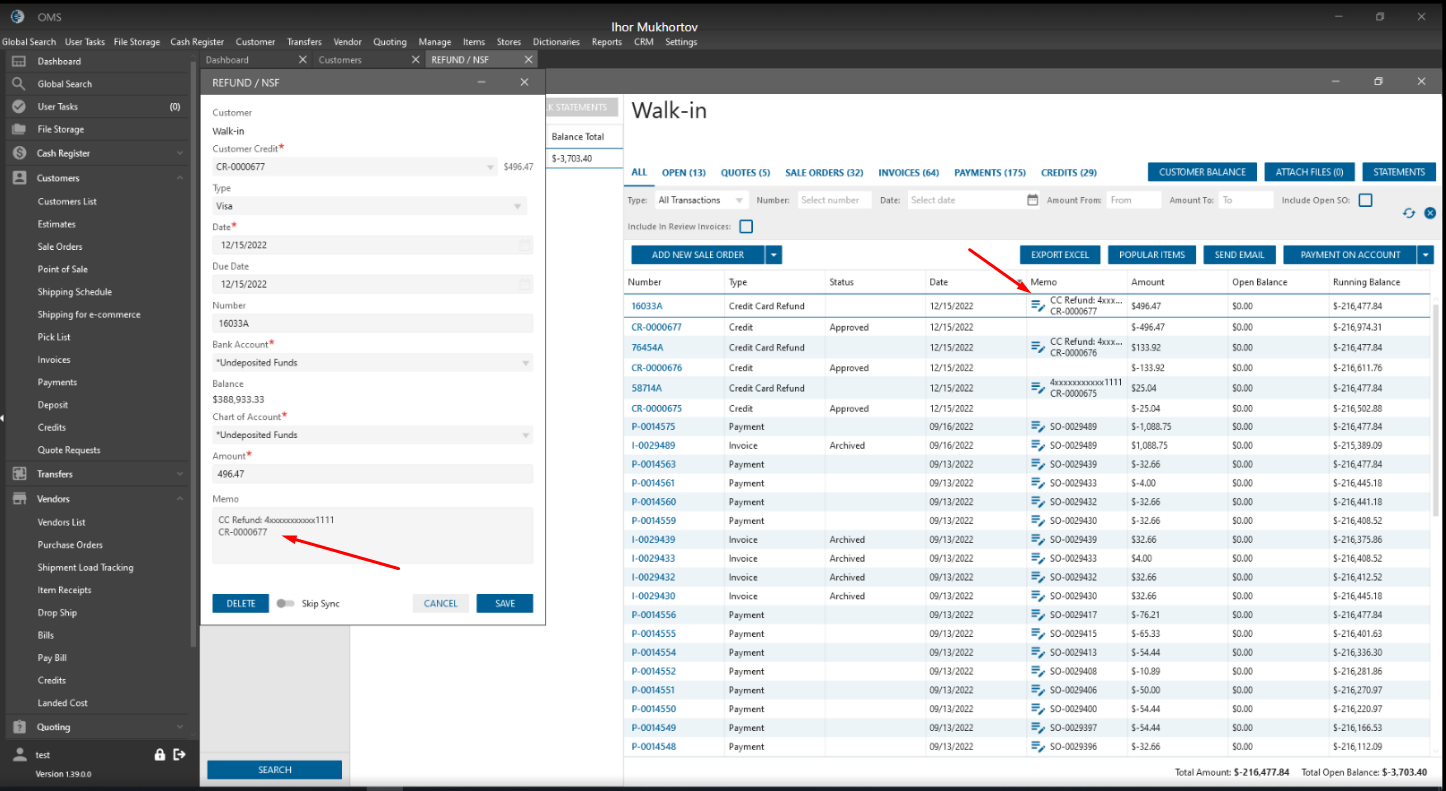 - Refund / NSF edit form -> “Memo” field at the bottom;