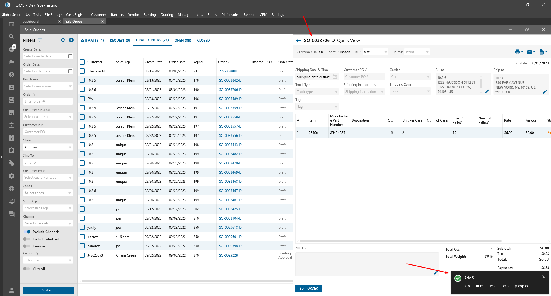 - the user has the ability to copy Order number:
