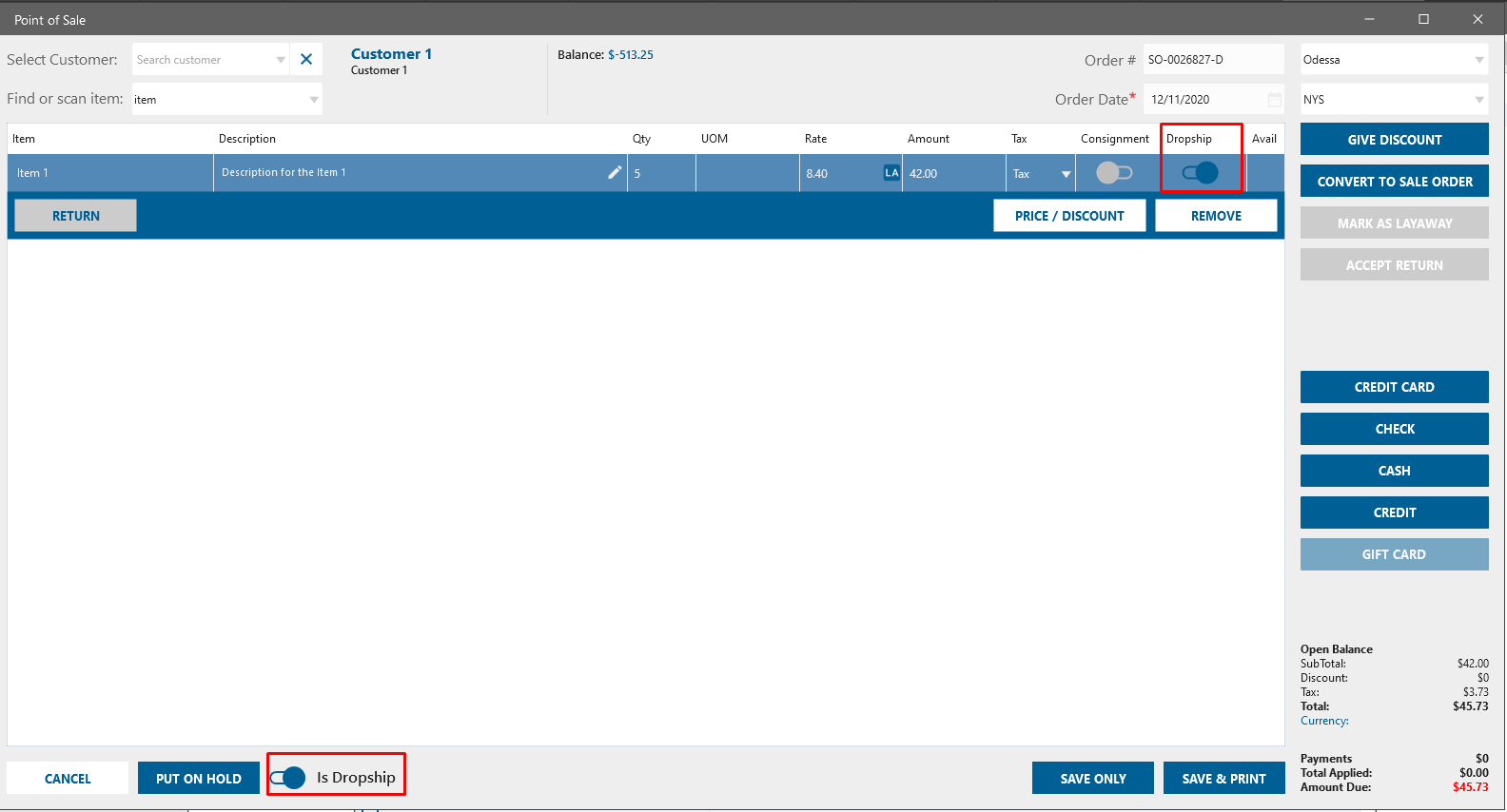 For the Dropship functionality leveraging on the POS form was implemented Dropship checkbox
