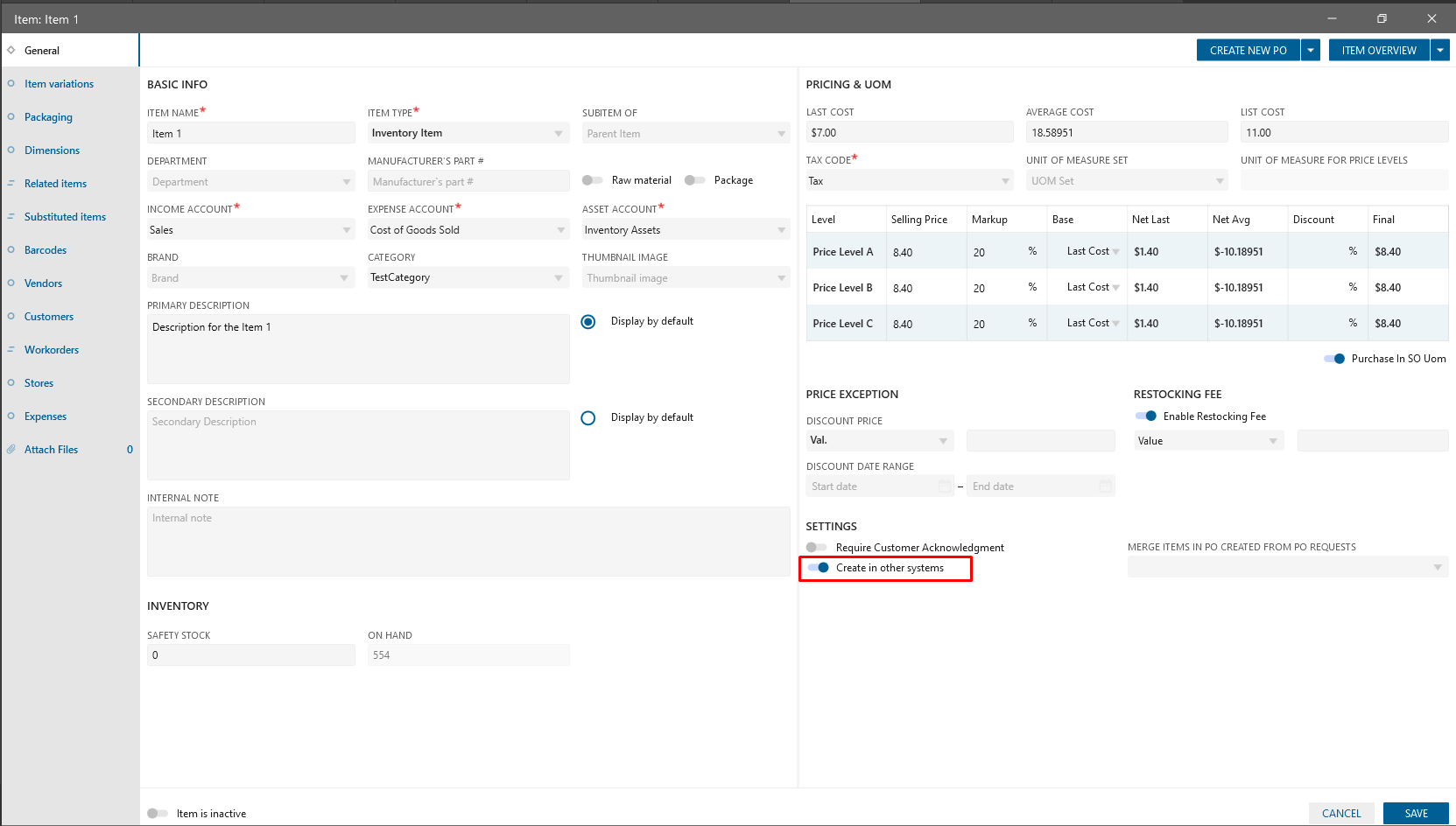 “Create in other systems” checkbox is added to the Item edit form.