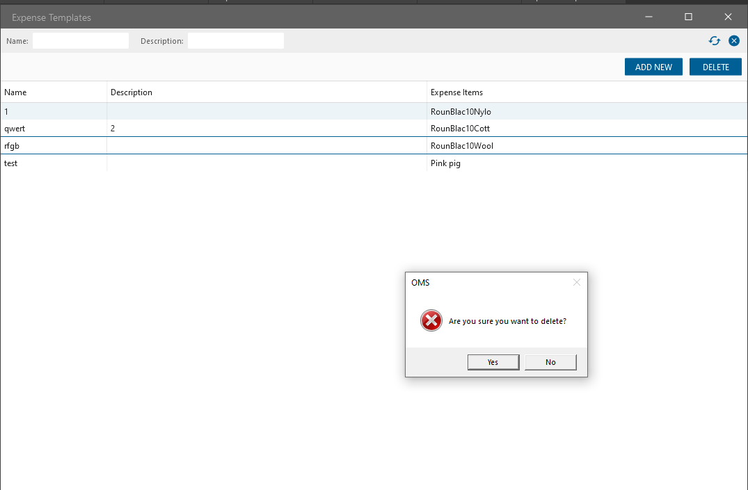 Expected result: If something is selected in the datagrid and not used, after clicking on the button the message should be displayed: “Are you sure you want to delete?”