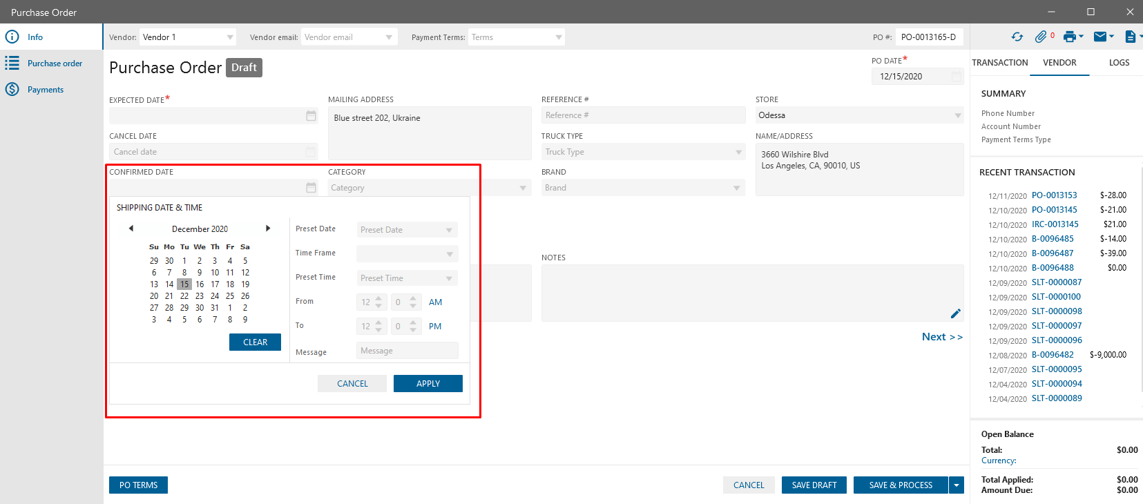 On the Purchase Order edit form for the Date area were implemented the following tweaks: