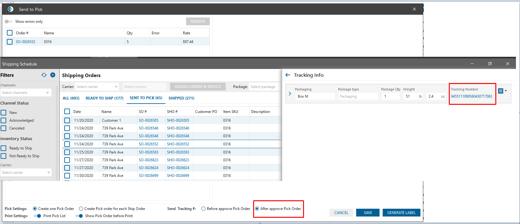 Shipping Schedule for e-Commerce form. Send to pick panel. If Send Tracking # with “After approving Pick order” option is set on then after Pick Order approving on the Tracking Info panel Tracking # should be displayed