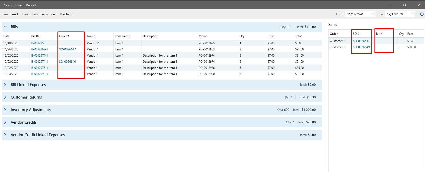 For the User awareness of created for the particular Item SOs and Bills were added to the Consignment form the following parameters:
