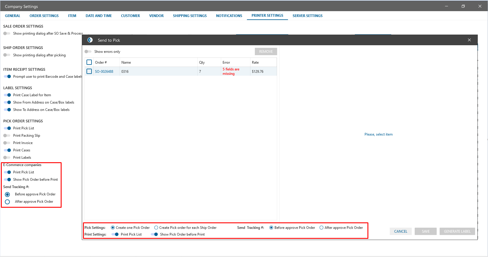 For the ability to manage Picking order creation, Pick order printing, Tracking # sending to the Company settings menu were added the following settings for e-Commerce companies: