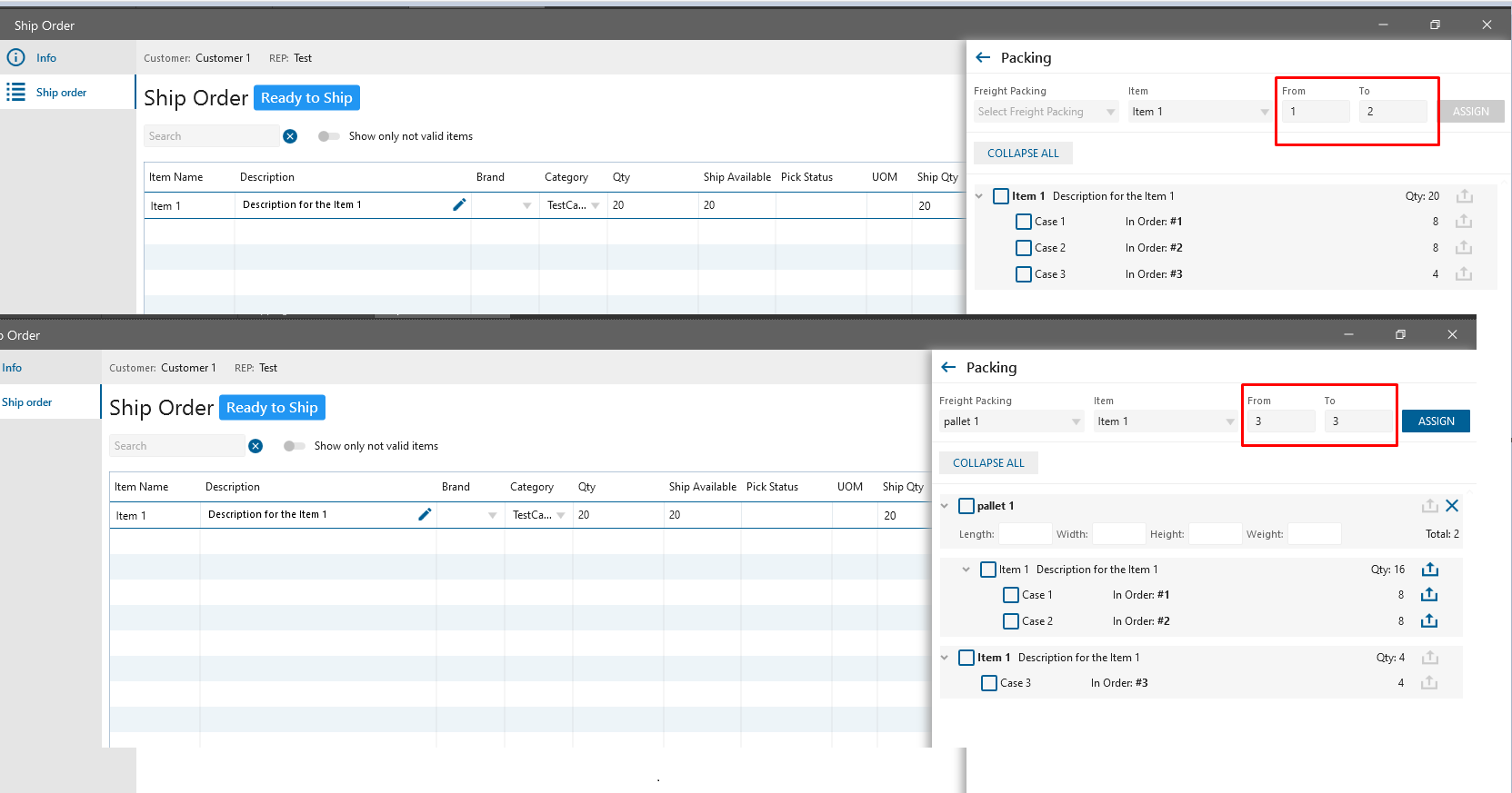 Open Freight panel again -> Add the same Item -> be sure that in From To fields are prefilled cases that left from the first assign