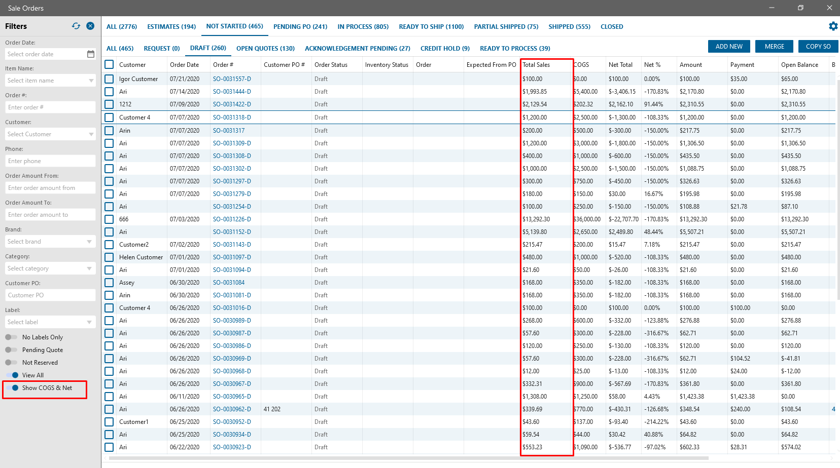 For seeing the column User has to set Show COGS&Net checkbox on the Filter panel
