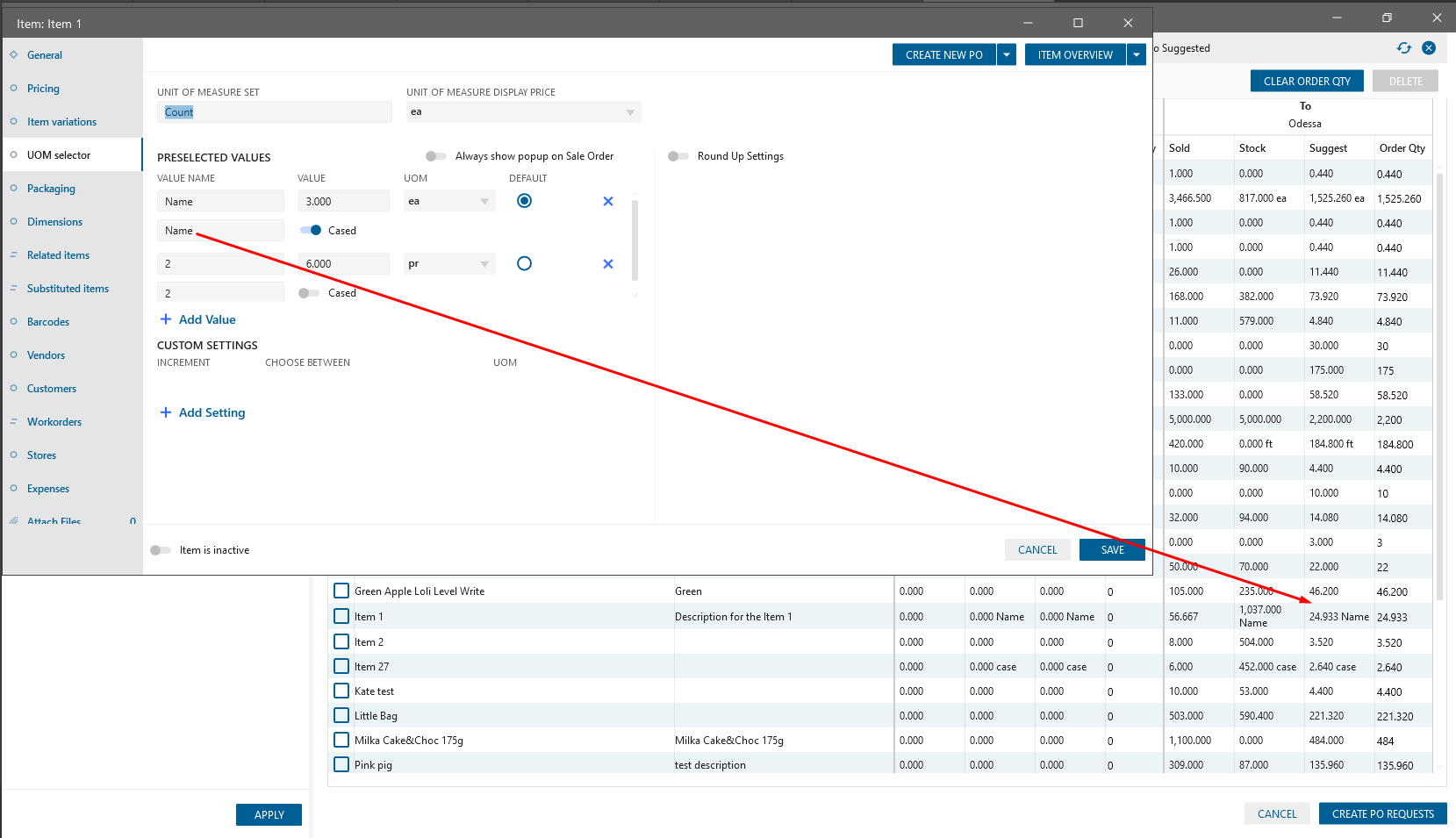 If UOM Selector is set for the particular Item then on the Suggest Stock panel will be displayed Suggested for this Item qty with the specified default value for the UOM