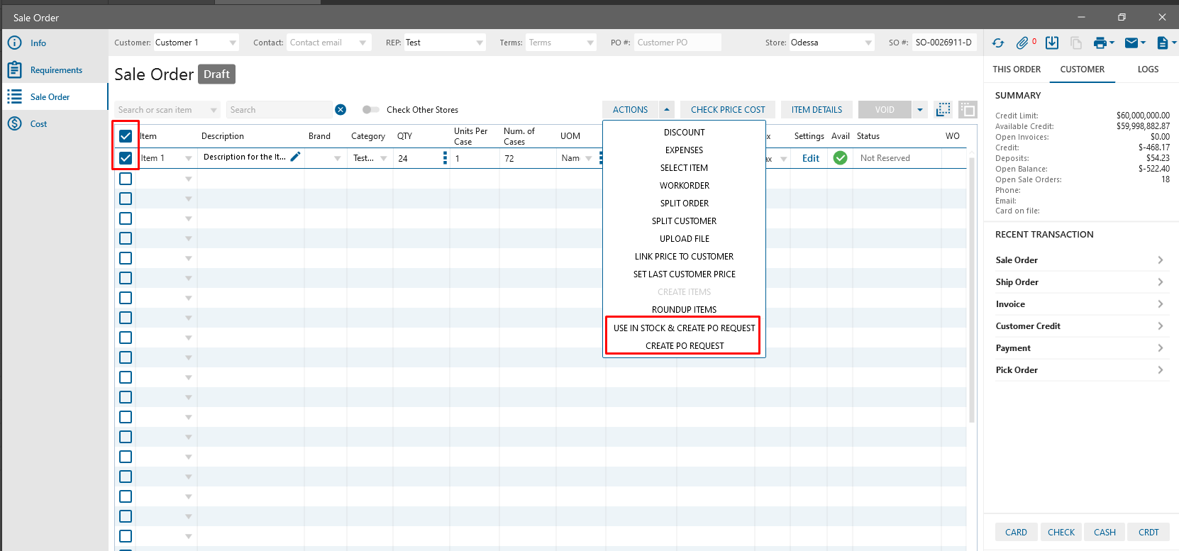 For the bulk assign actions “Create PO Request” or “Use In Stock & Create PO Request” for the group of Items to the Actions multi-button on the SO edit form were added buttons: