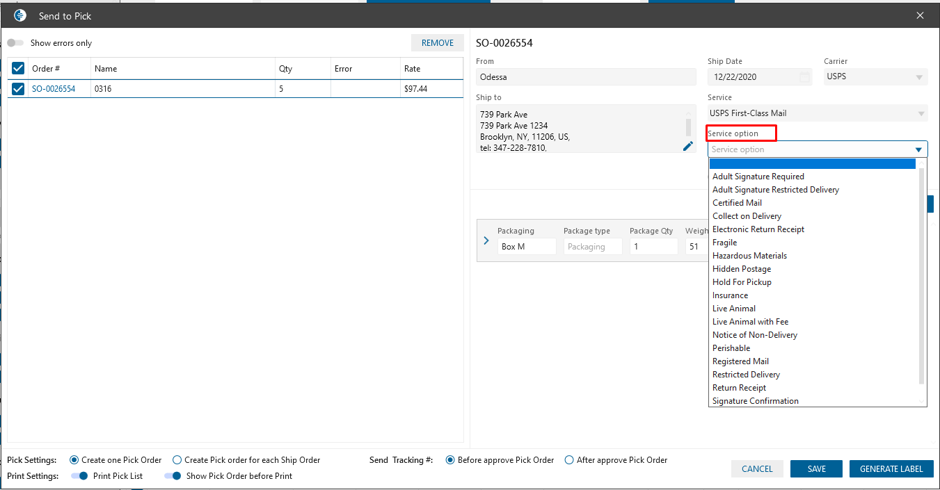 For the ability to choose the sub Service for the Service Company (USPS) on the Send to Pick panel (in order Carrier was set) was added Service option dropdown