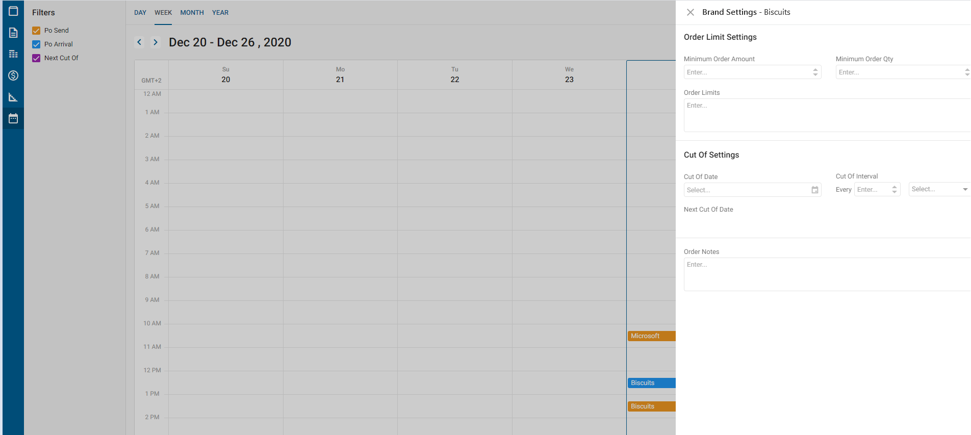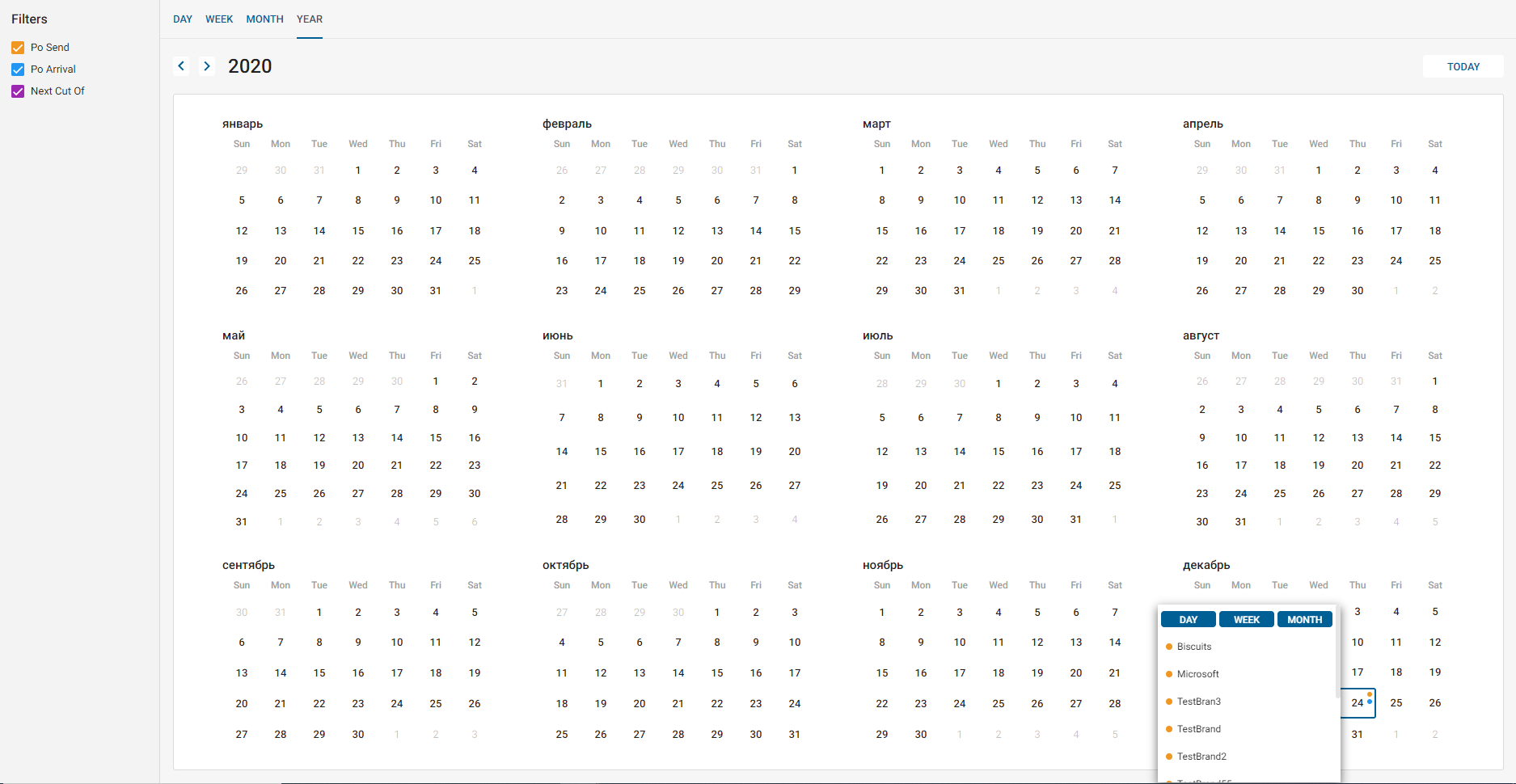 After clicking on the marked Date, will appear pop-up with Brands that have statuses relevant for the chosen filters. User is able to choose Day, Week, or Month view for these Brands.