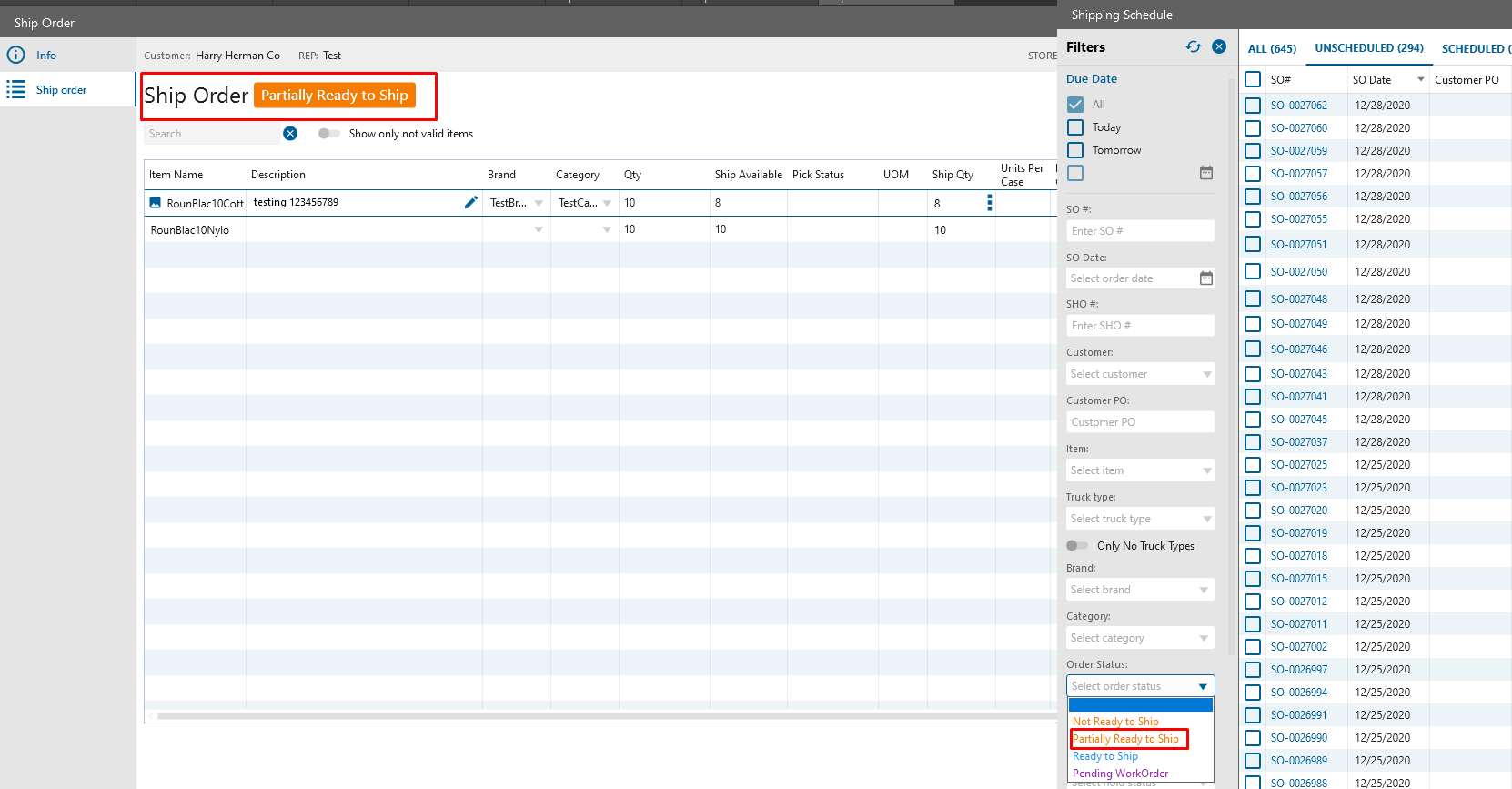 If SHO status is “Partially Ready to Ship” it should be displayed on Shipping Scheduled form. “Partially Ready to Ship” is added to the Filters in Order status dropdown