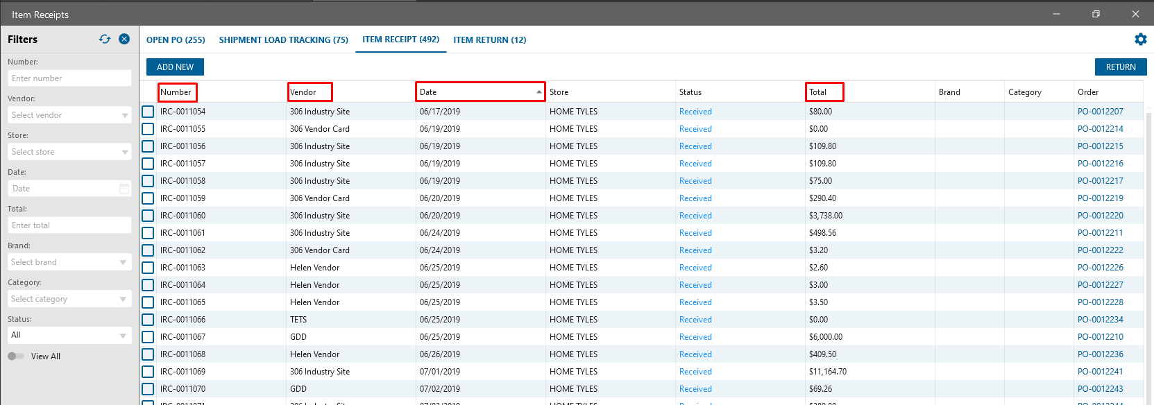 Item Receipt. Added sorting by Number, Vendor, Date, Total