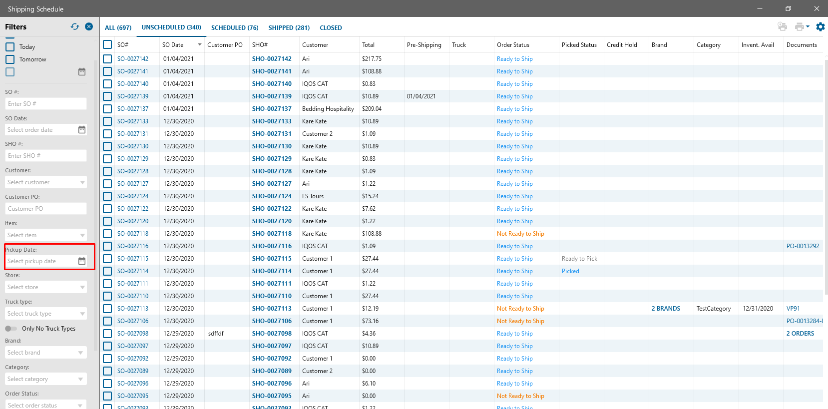 - filter by Pickup Date