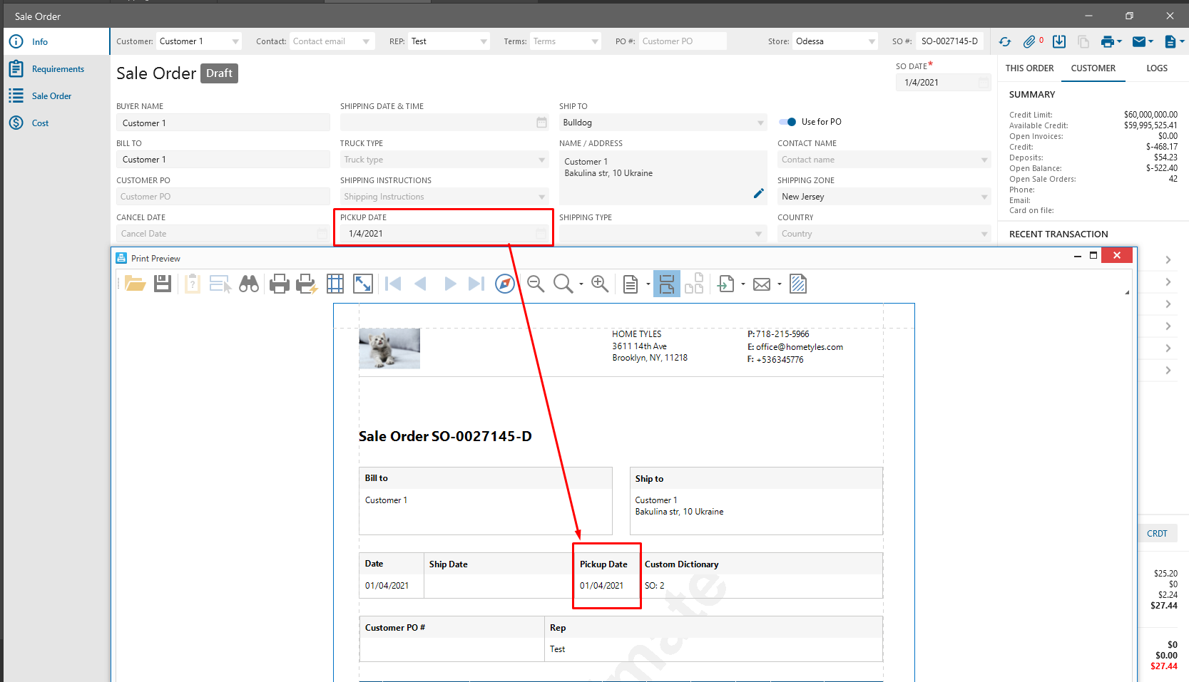 - Sale order. Pickup Date is displayed as on the edit form as on the pdf file