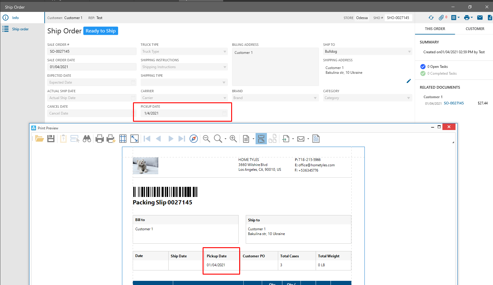- Ship order. Pickup Date is displayed as on the edit form as on the pdf file. By default is taken from the corresponding Sale order