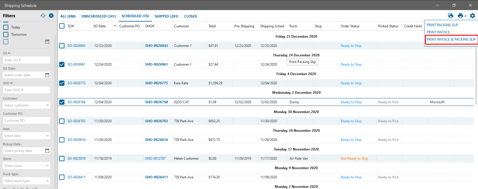 - verify that for every checked Customer printed Packing Slip and Invoice one by one