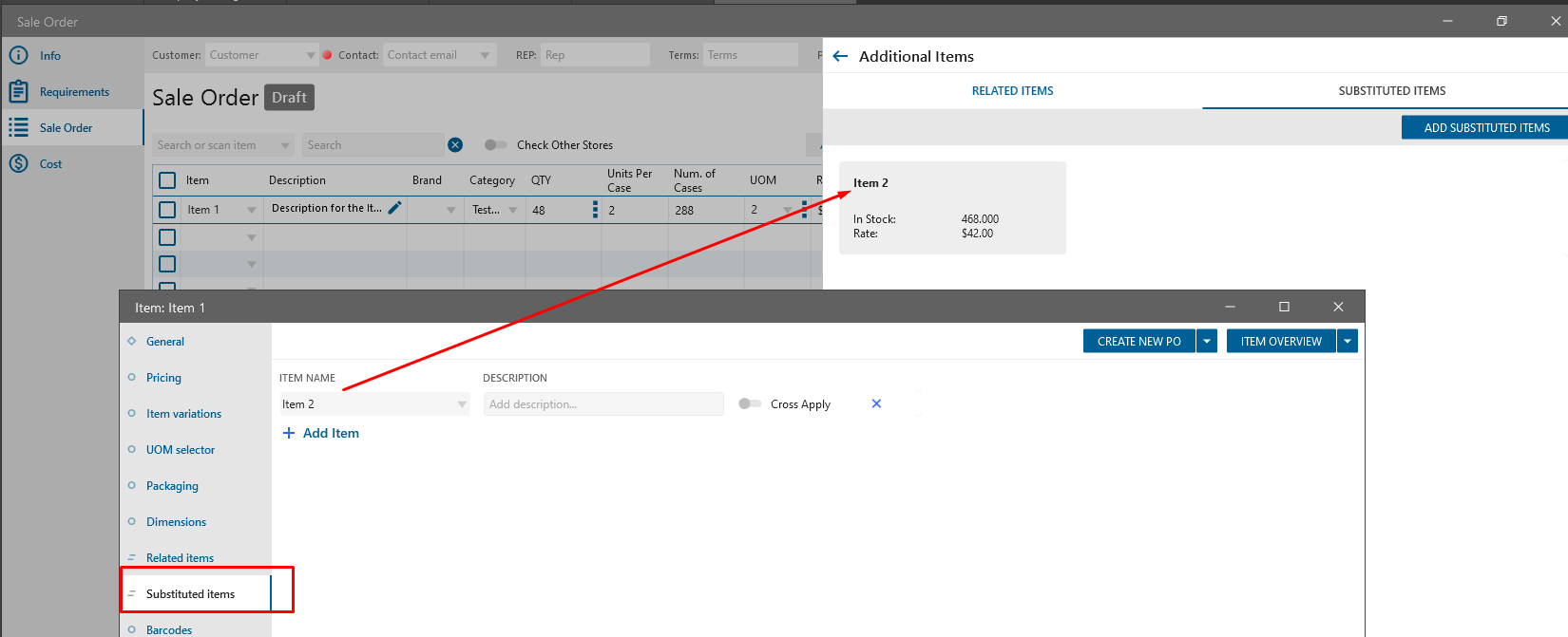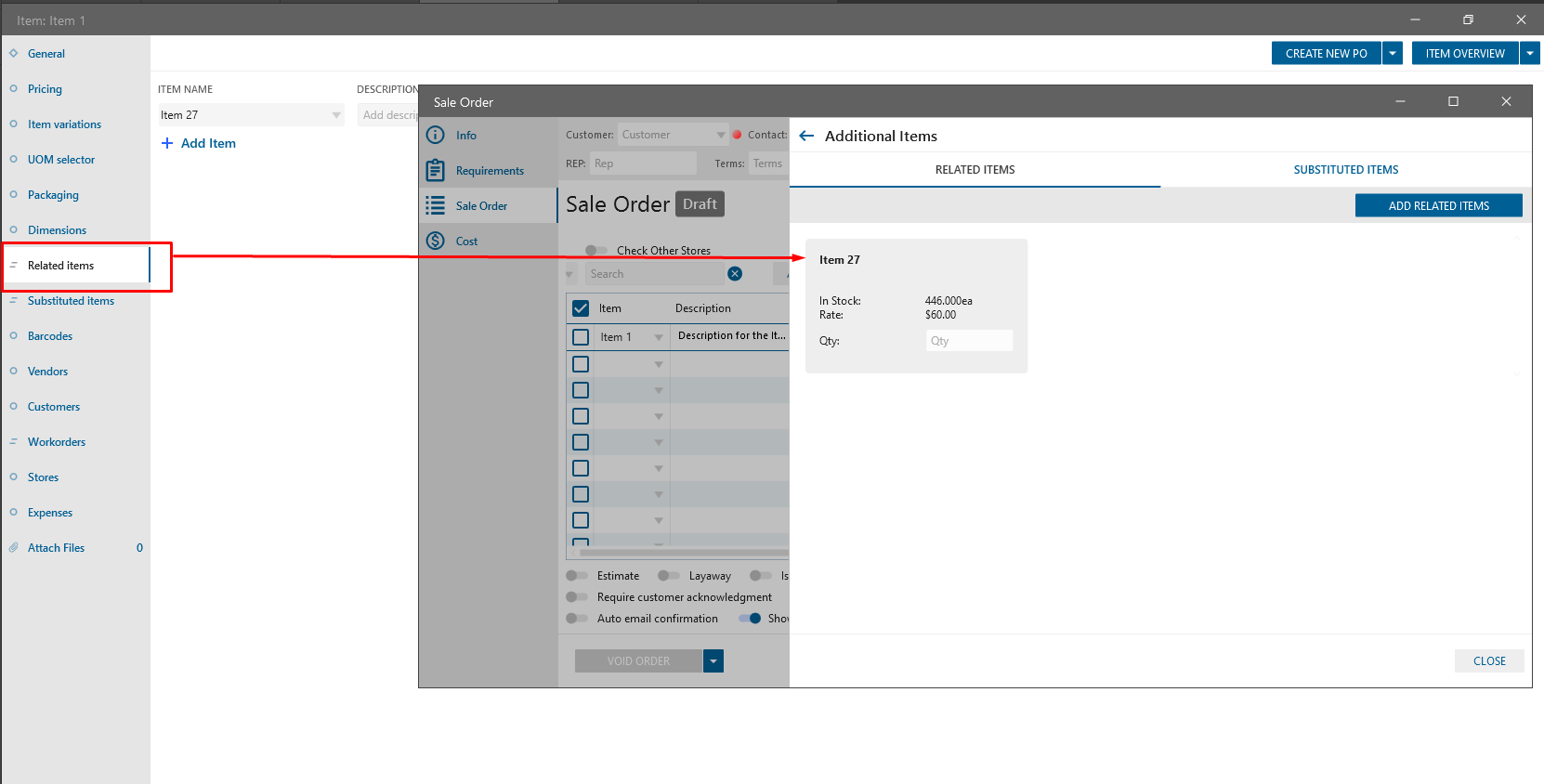 - if checked as “Auto Open Related Item” checkbox as “Auto Open Substituted Item” checkbox then the Additional Items panel will be opened on the Related tab