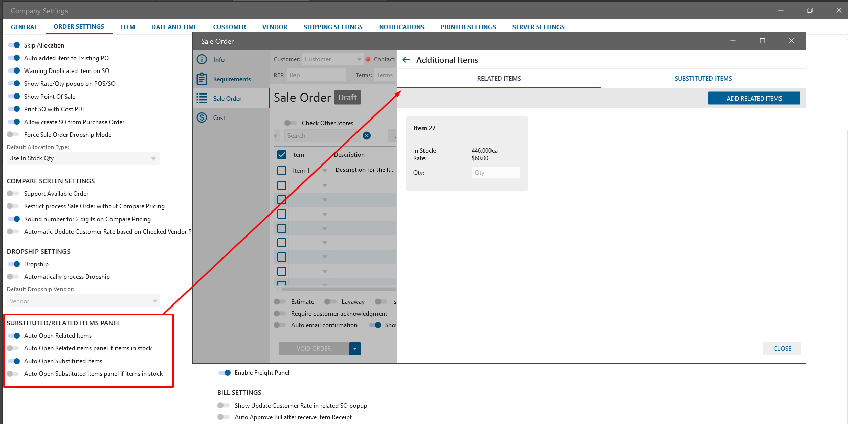 There on the Company Settings form are options for the Substituted/Related Items Panel: