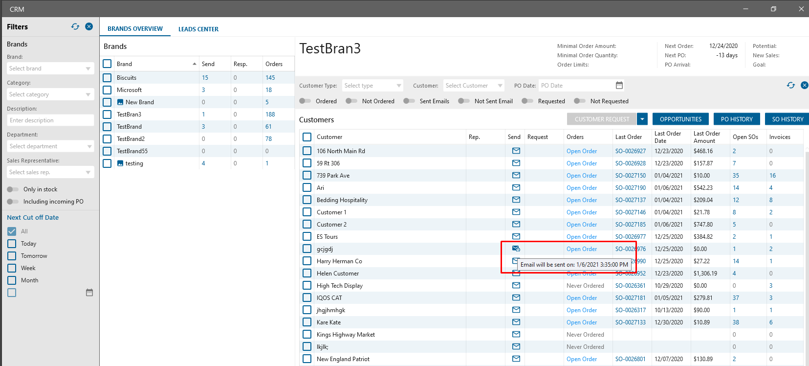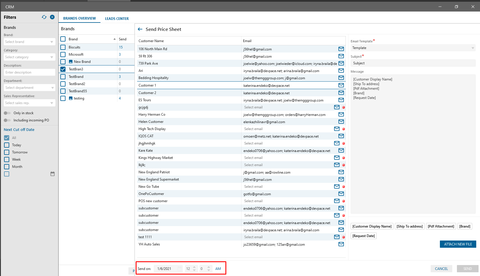 To send postponed emails go by the following path: CRM -> Brand Overview -> Send Price Sheet button -> Send on date-picker