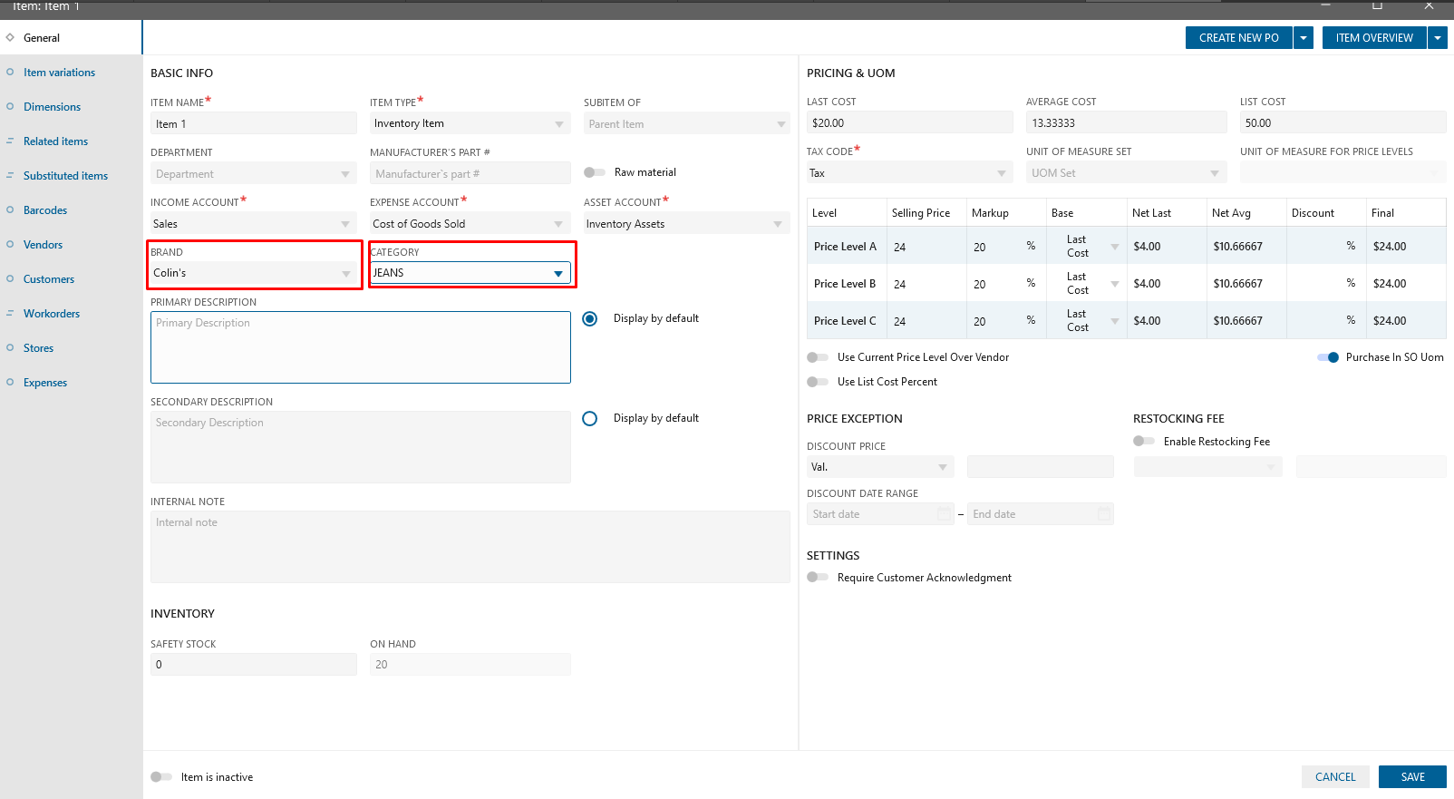 If PO request is generated based on AO or SO then Brand and Category is taken from the Item edit form, not from SO