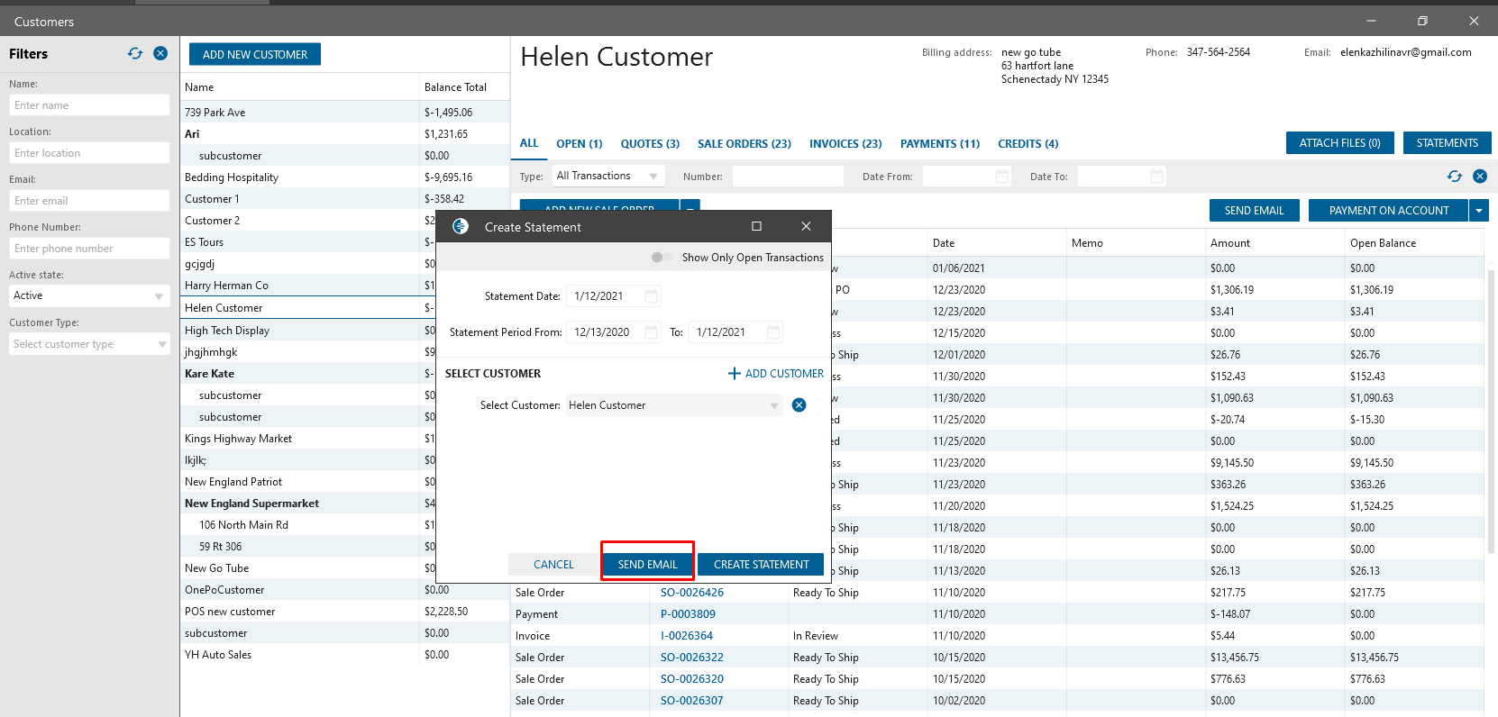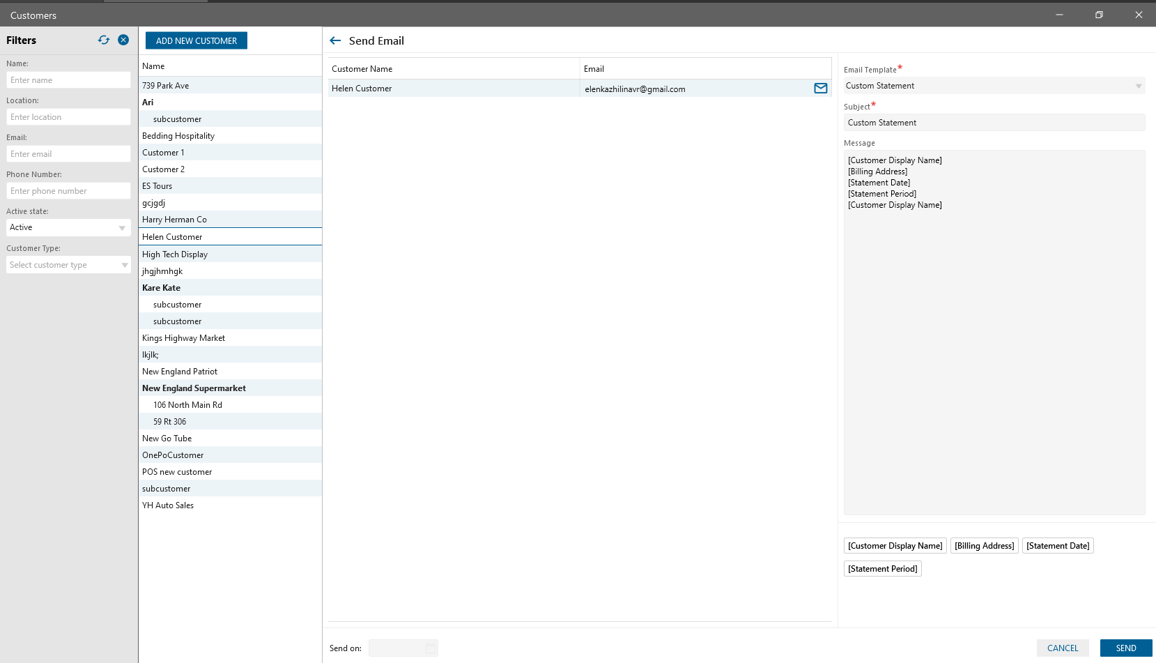 - Customers. On the Send email form should be prefilled all selected customers from the “Create Statements”