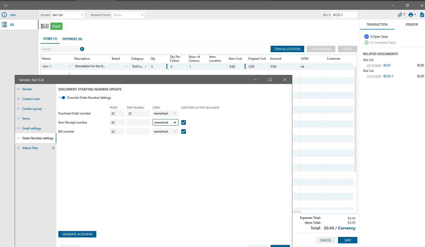 - if Bill/IR created from PO then Prefix/number is taken from Company settings or Vendor settings