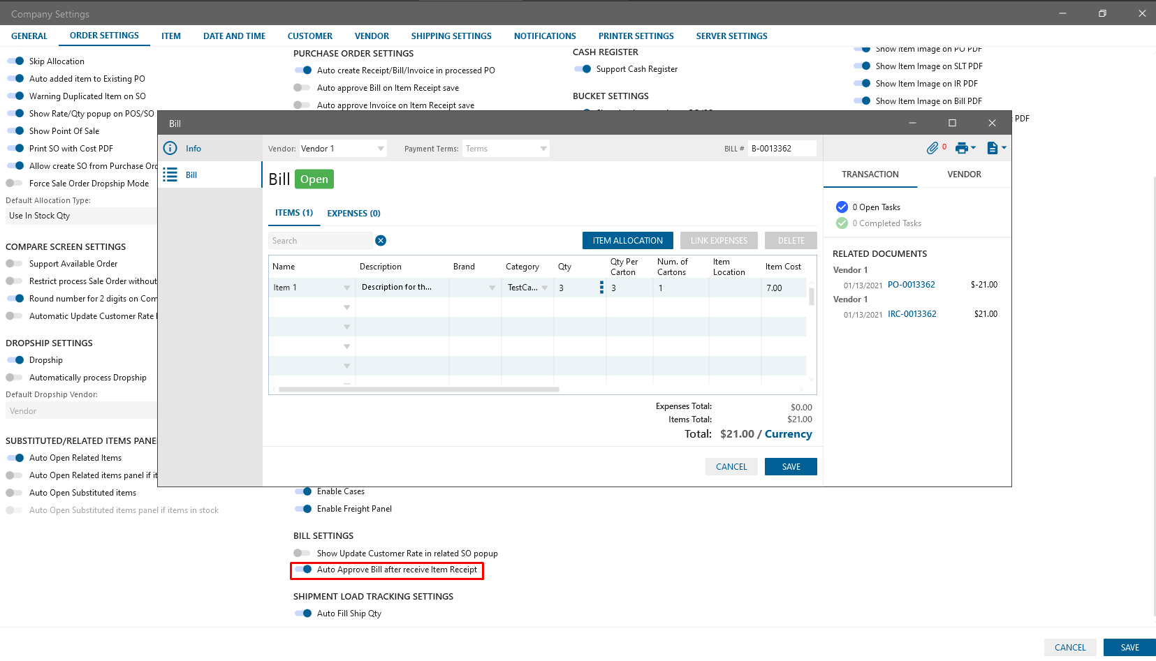 In order User set on the option “Auto Approve Bill after receive Item Receipt” in Company Setting, after clicking Save on the Item Receipt, Bill will be created automatically without any additional message