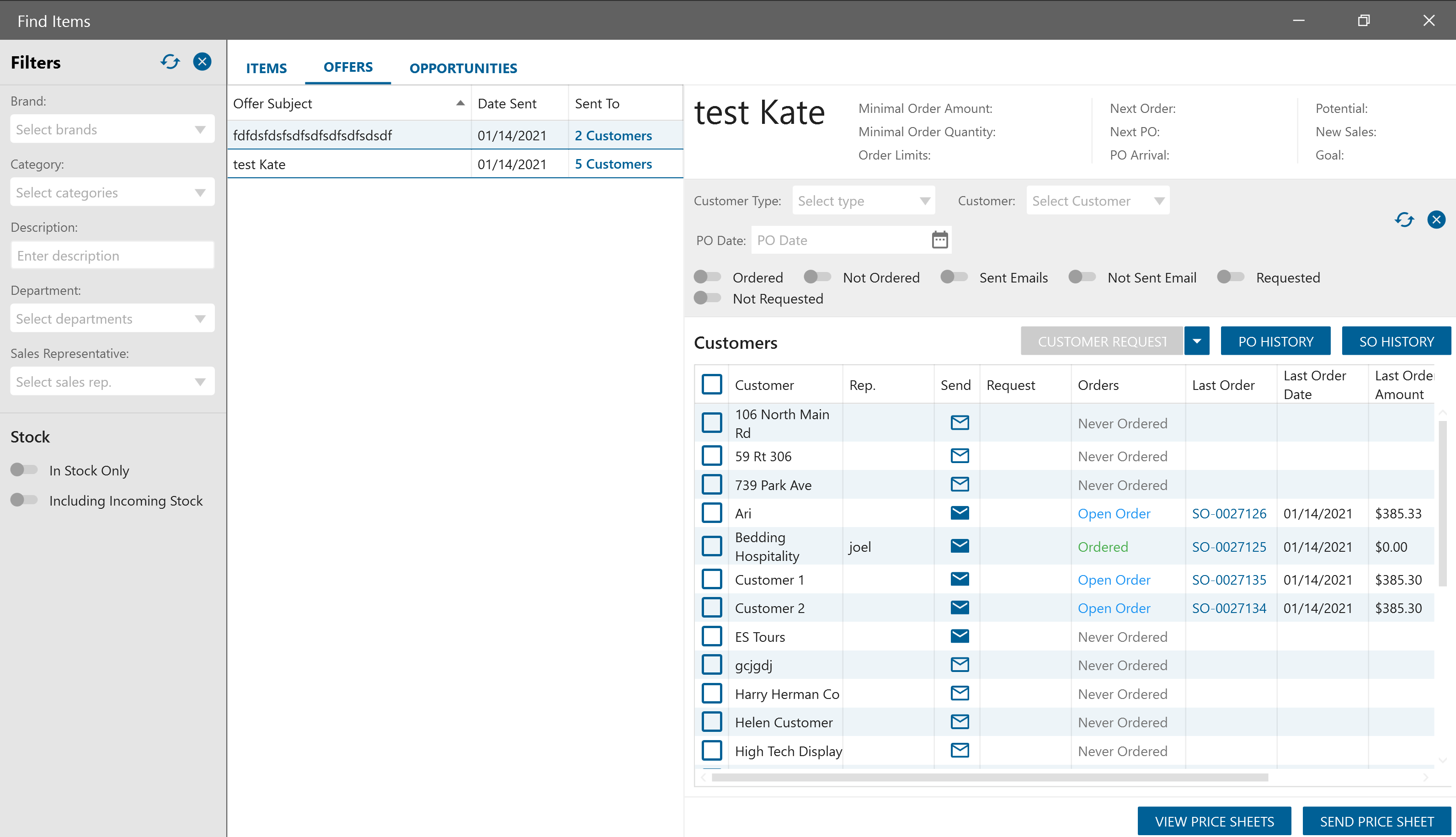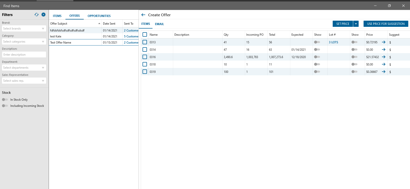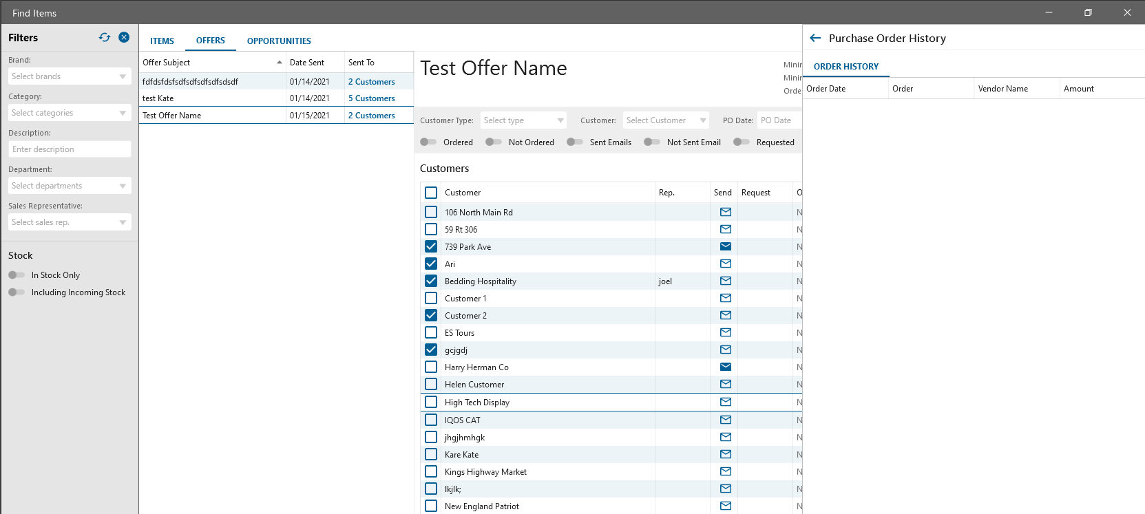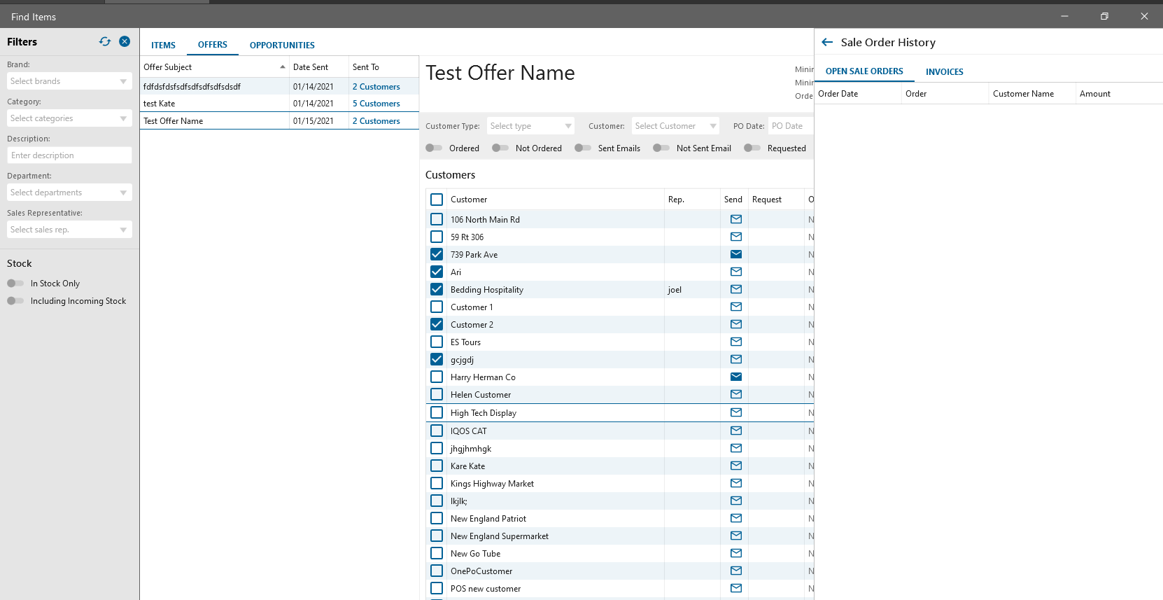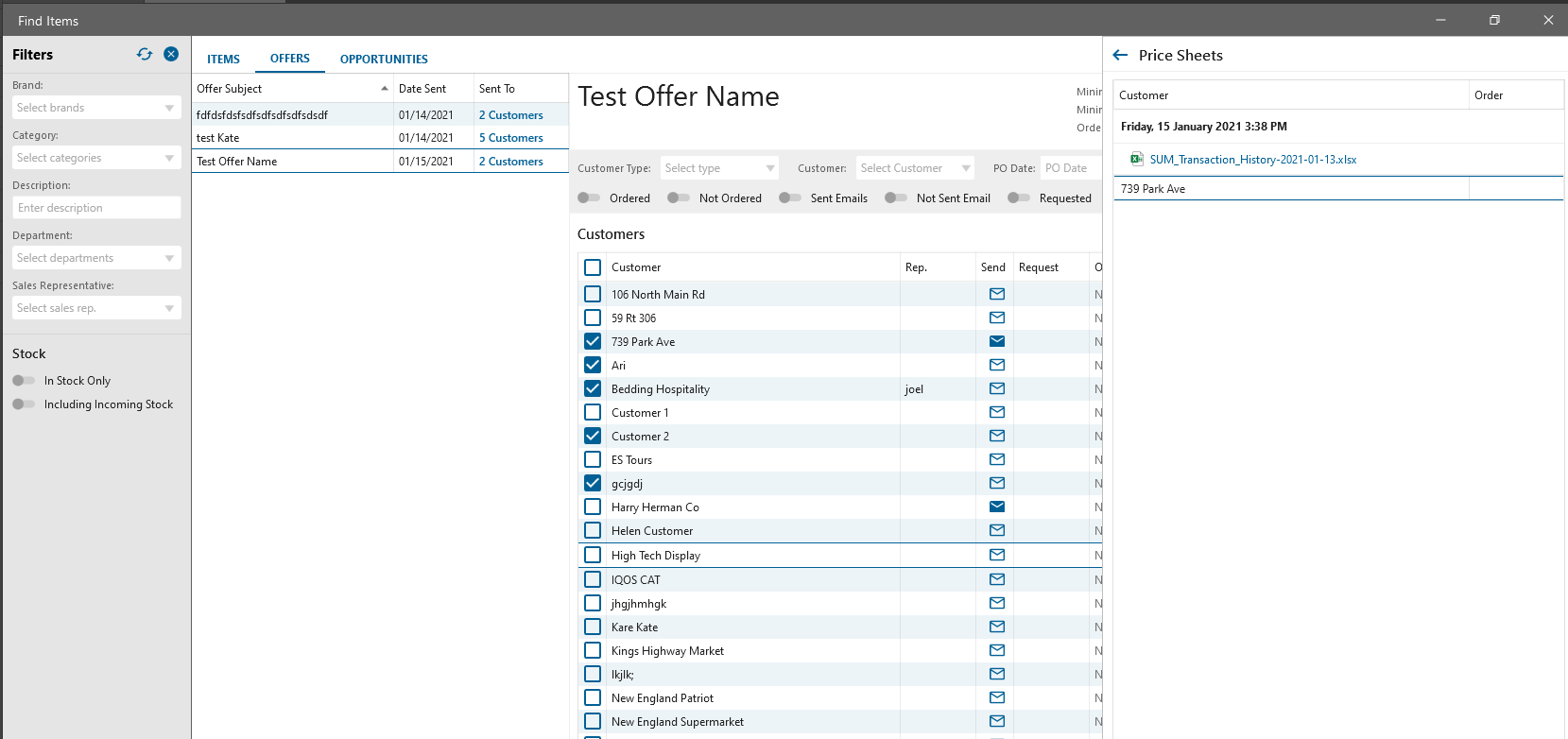 - Brand. Refers to the Customer datagrid. Displays Customer that has offers with items with specified Brand