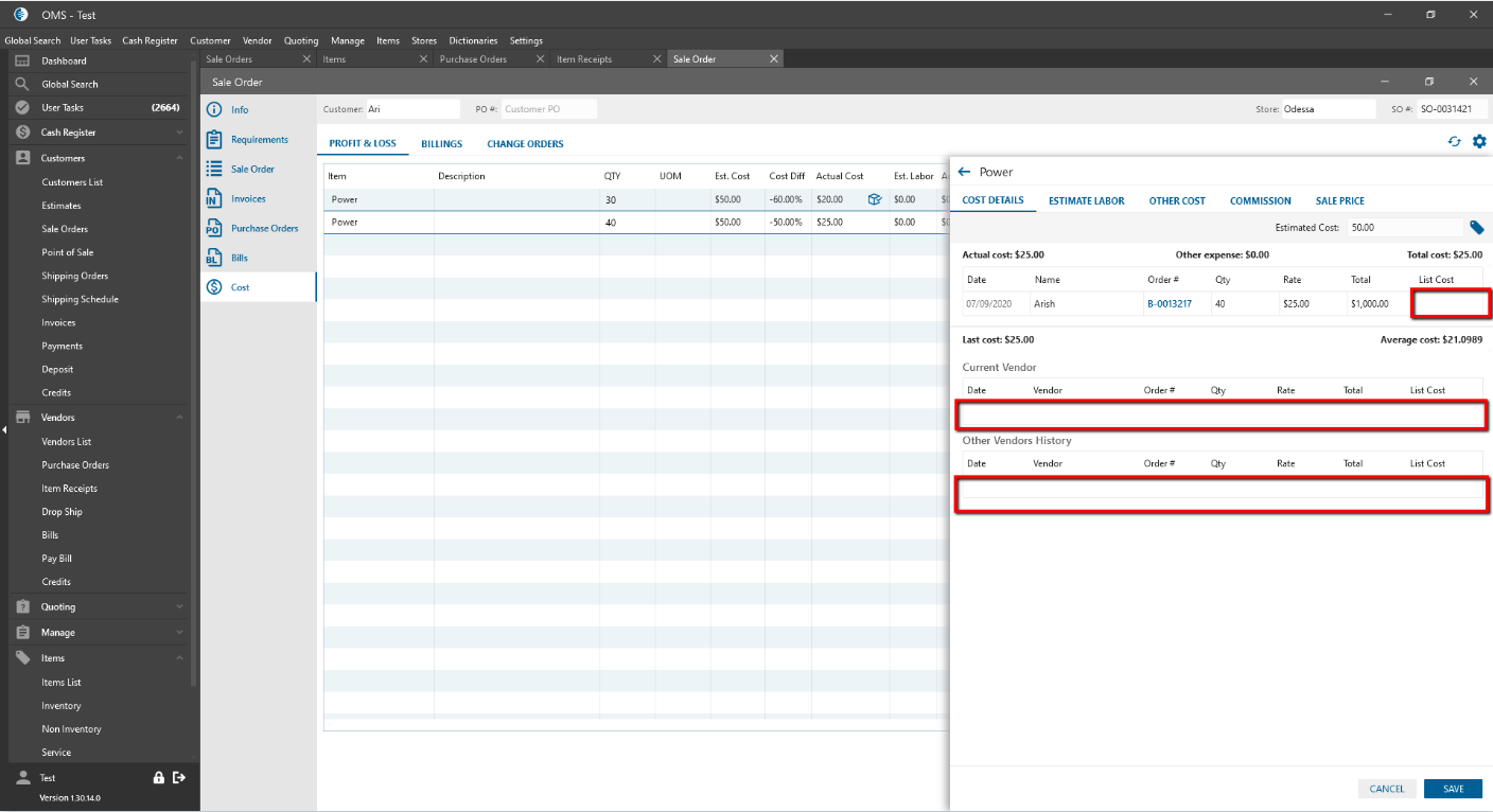 Expected result – On the Cost Panel should be displayed Orders which was linked to SO, Orders which include this Item, and is not displayed List Cost