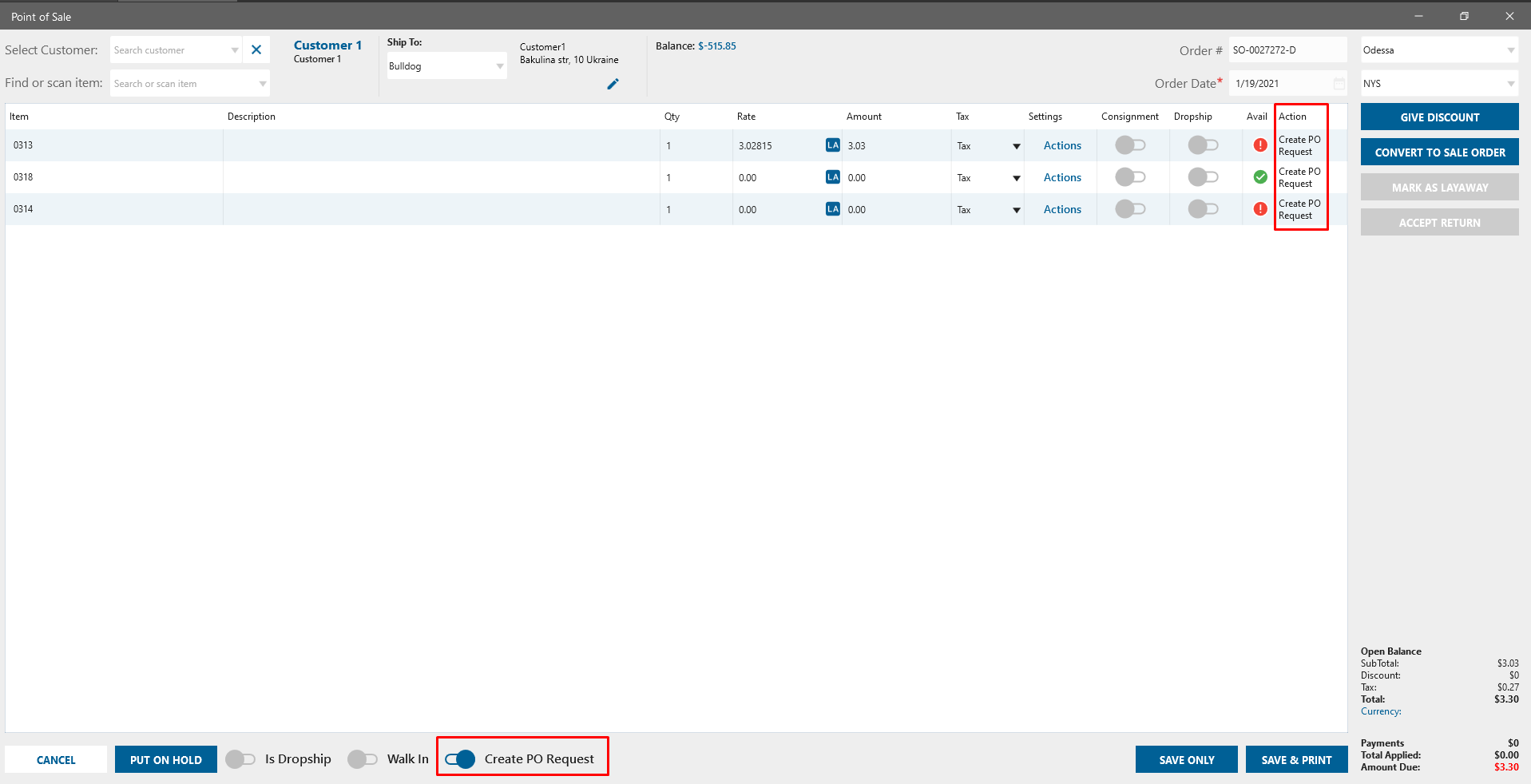 For this functionality were implemented Walk in and Create PO request on the Make a Sale form