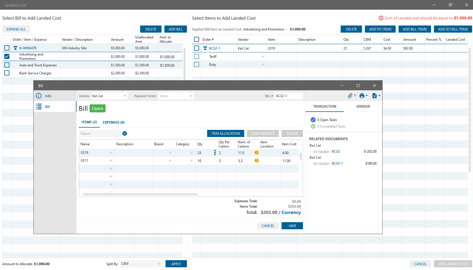- Qty Per Carton/Num.of Cartons/CBM columns are added to the Bill edit form