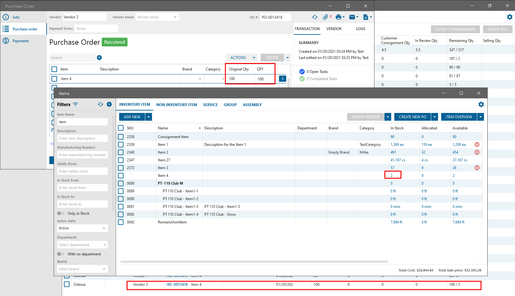 - to the Remaining qty column values added qty currently connected to Consignment: