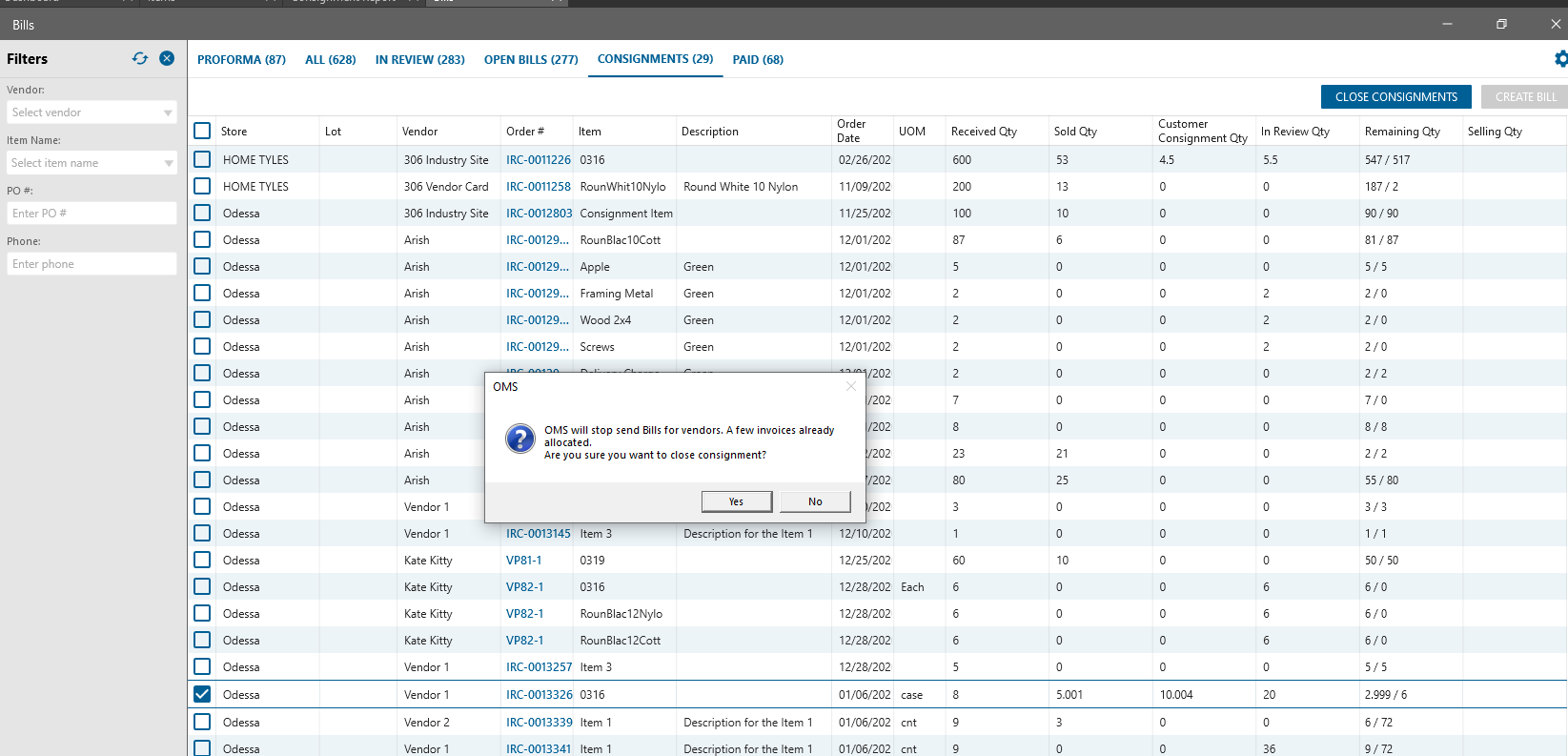 - if some invoices were created for the Consignment then message should be displayed: “OMS will stop send Bills for vendors. A few invoices already allocated. Are you sure you want to close consignment?”