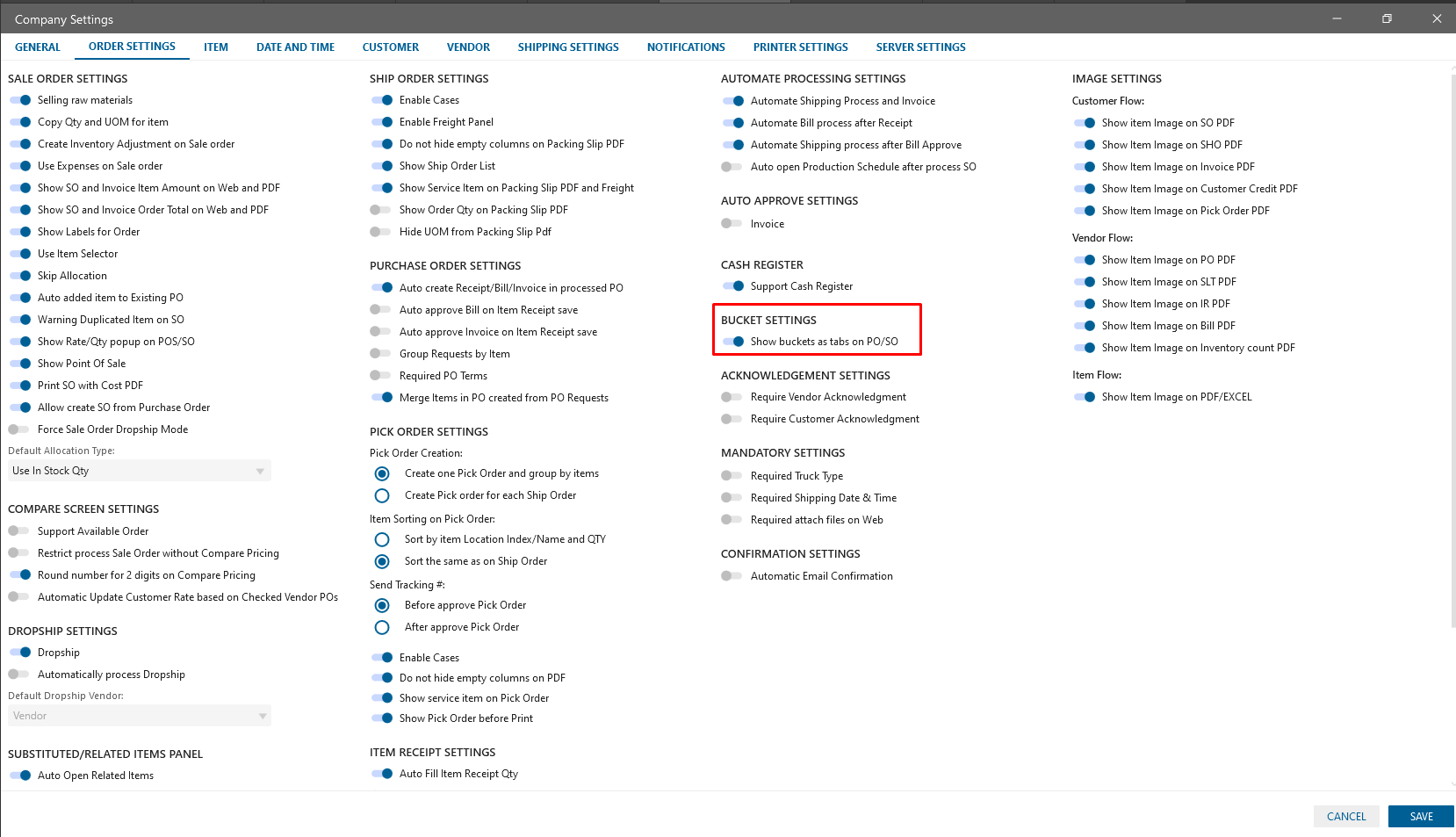 If in Company setting “Show buckets as tabs on PO/SO” is switched on