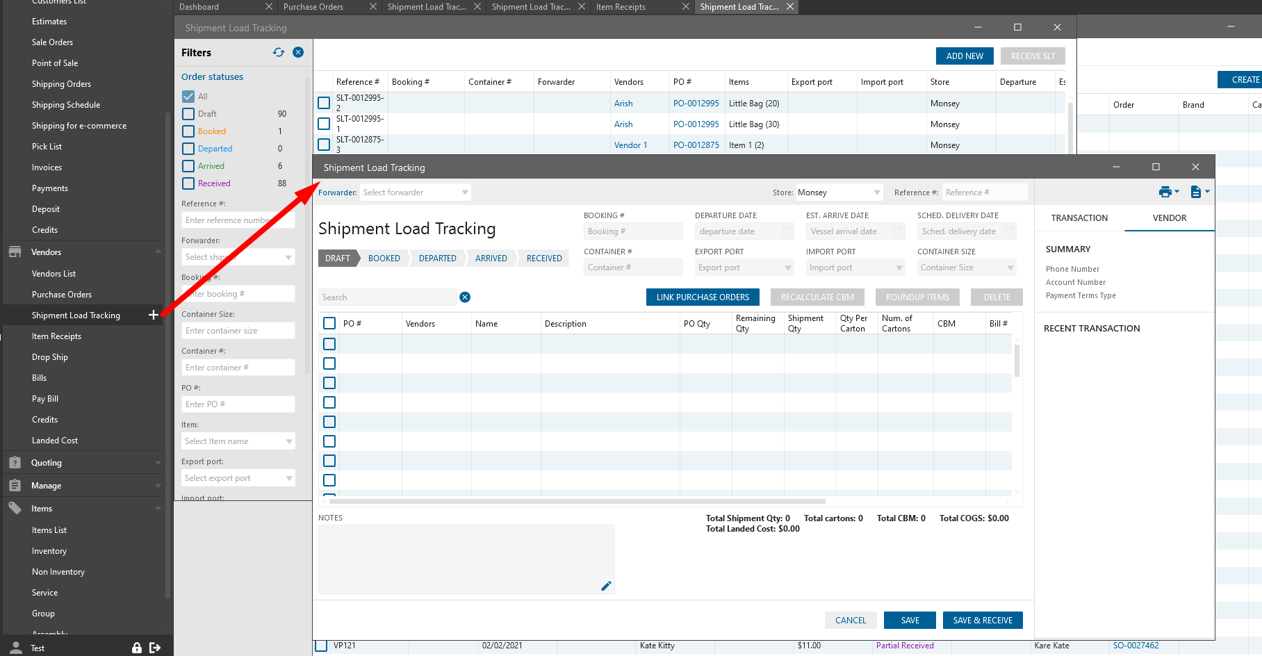 - Item Receipt -> Shipment load tracking tab