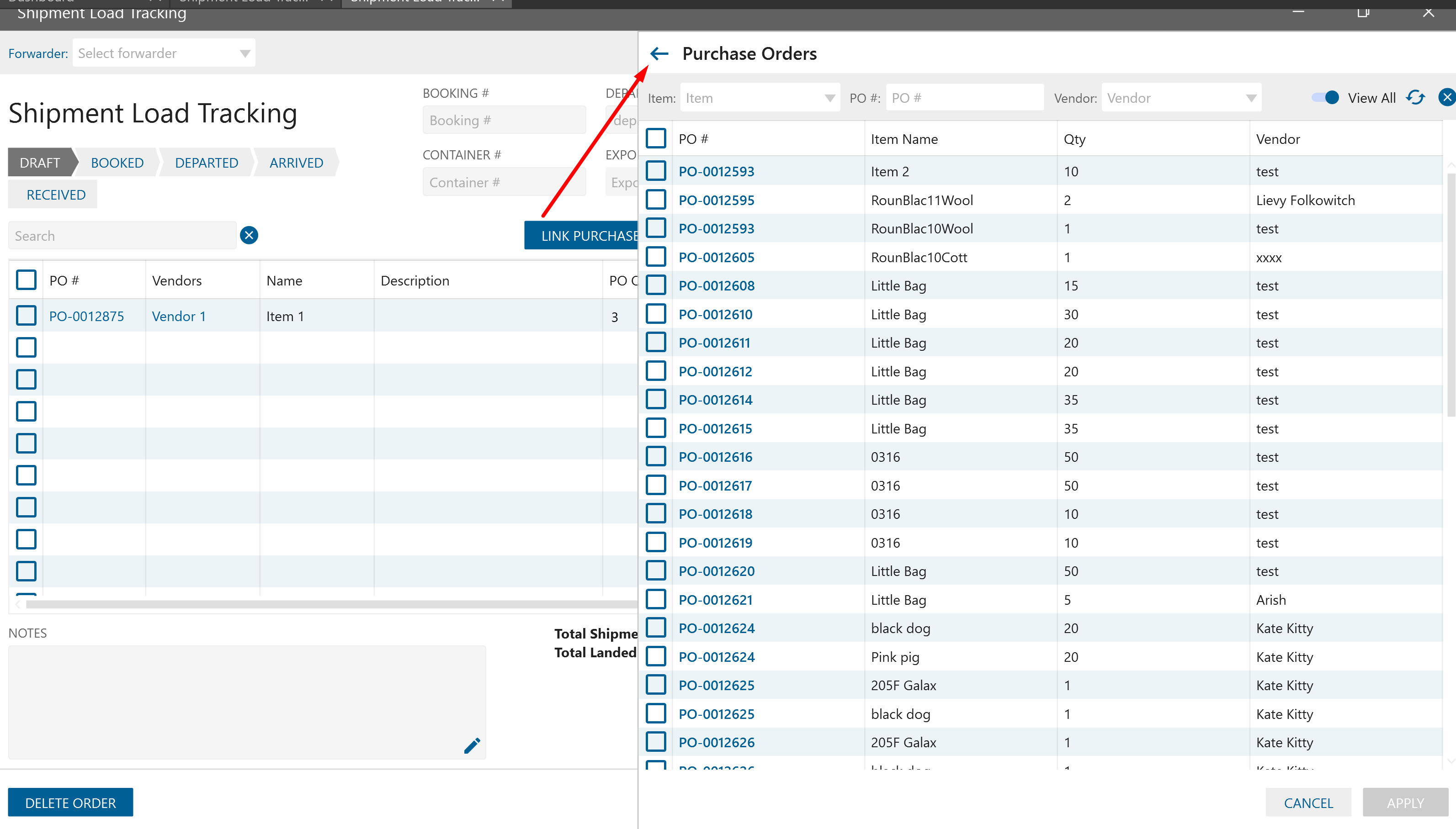 “Purchase Orders” panel contains list of PO item Qty that is not linked to any SLT